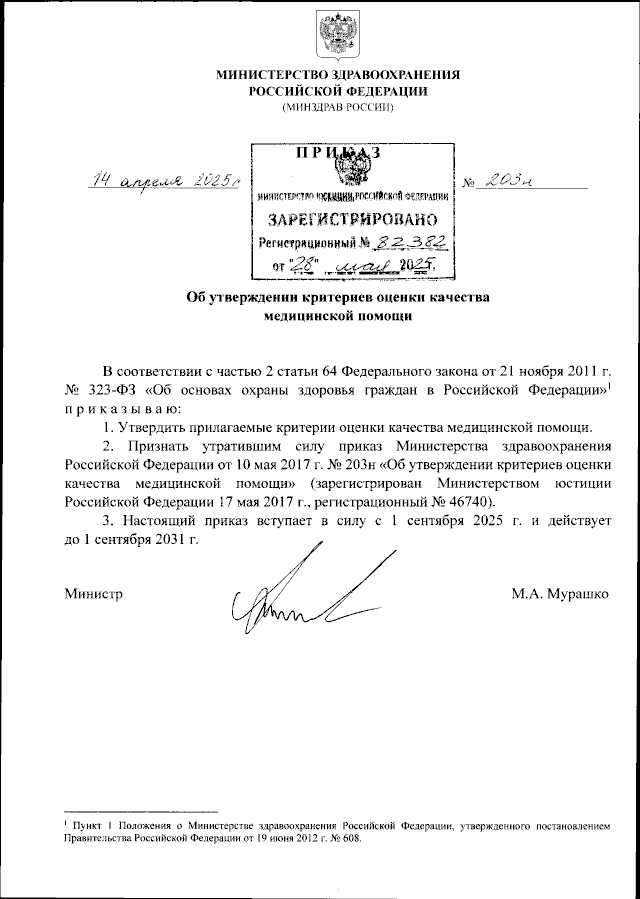 Приказ Министерства здравоохранения Российской Федерации от 14.04.2025 № 203н