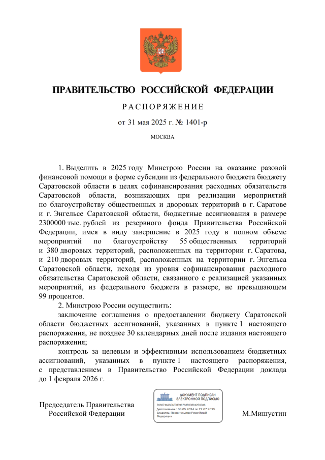 Распоряжение Правительства Российской Федерации от 31.05.2025 № 1401-р
