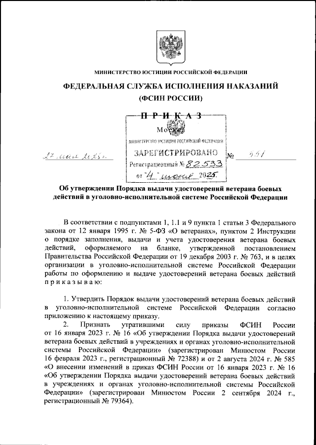"Об утверждении Порядка выдачи удостоверений ветерана боевых действий в уголовно-исполнительной системе Российской Федерации"