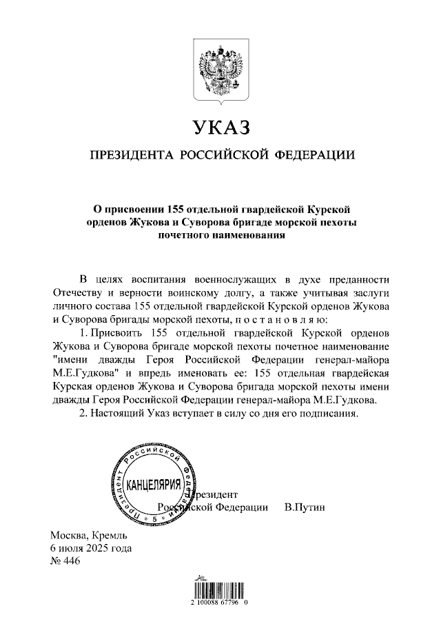 Указ Президента Российской Федерации от 06.07.2025 № 446