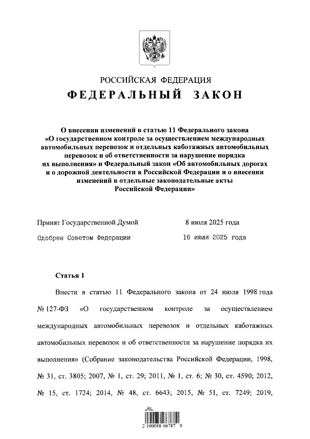 "О внесении изменений в статью 11 Федерального закона "О государственном контроле за осуществлением международных автомобильных перевозок и отдельных каботажных автомобильных перевозок и об ответственности за нарушение порядка их выполнения" и Федеральный закон "Об автомобильных дорогах и о дорожной деятельности в Российской Федерации и о внесении изменений в отдельные законодательные акты Российской Федерации"