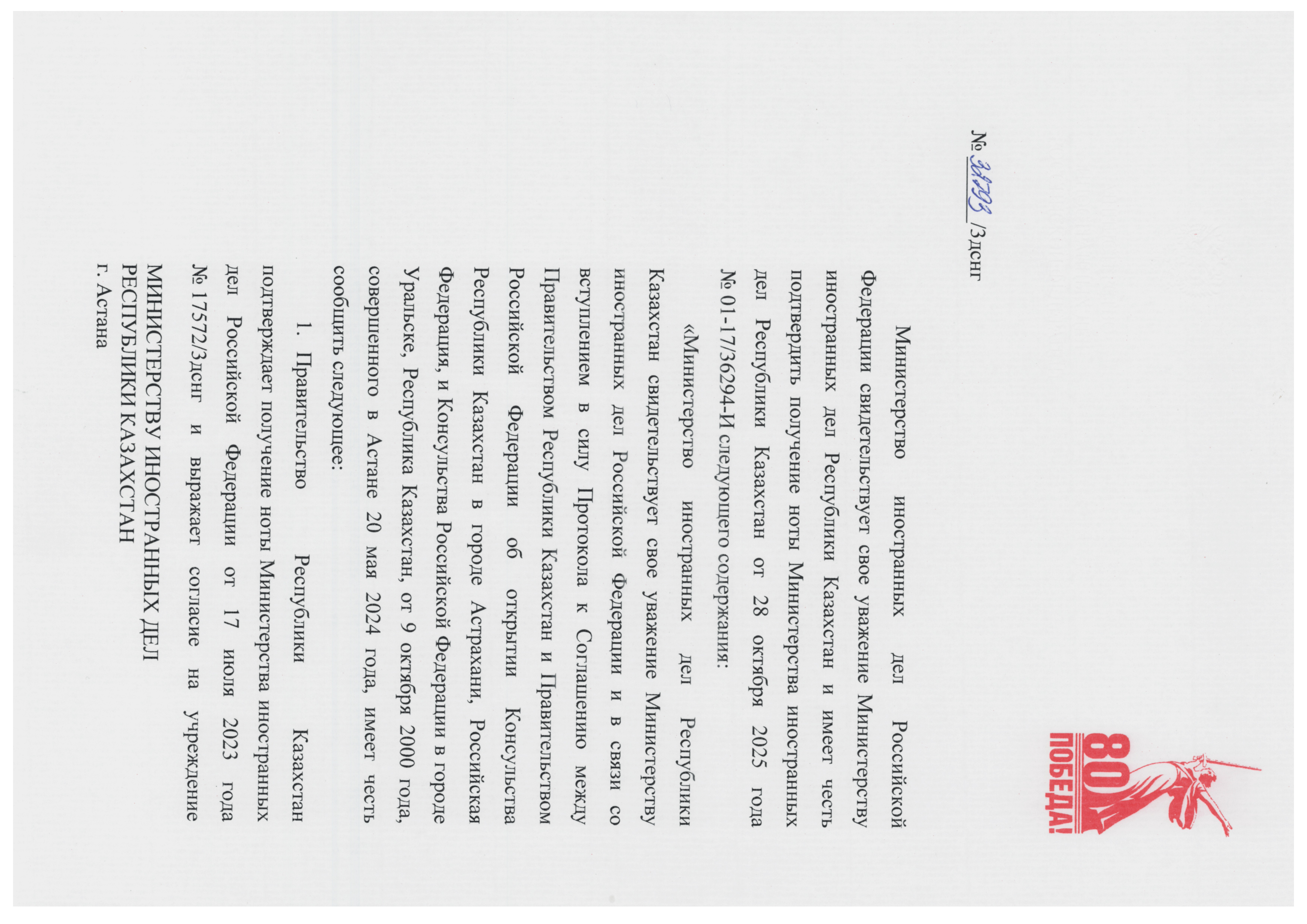 Соглашение между Правительством Российской Федерации и Правительством Республики Казахстан об учреждении Генерального консульства Российской Федерации в городе Актау, заключенное в форме обмена нотами от 28 октября 2025 года и 10 ноября 2025 года