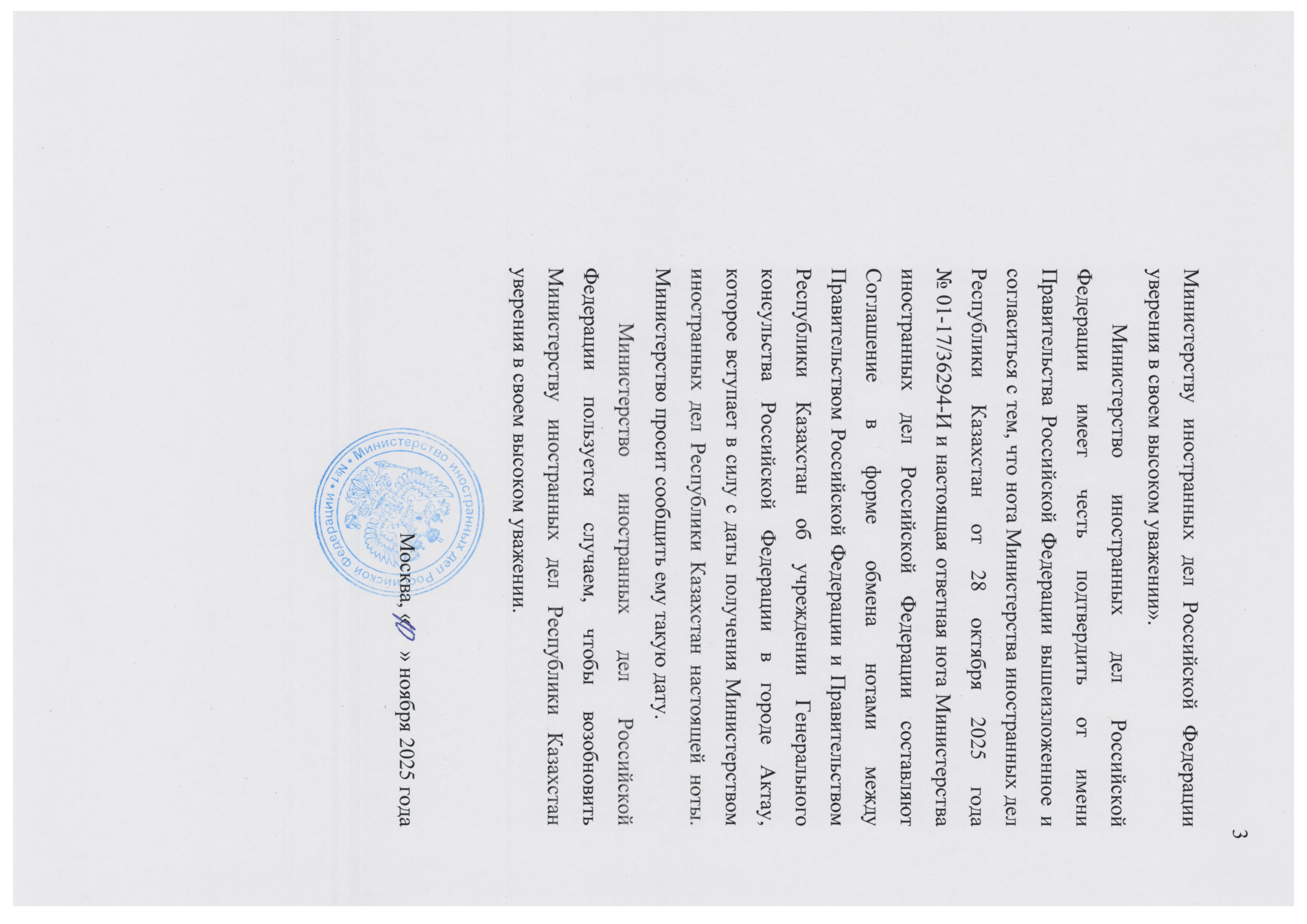 Соглашение между Правительством Российской Федерации и Правительством Республики Казахстан об учреждении Генерального консульства Российской Федерации в городе Актау, заключенное в форме обмена нотами от 28 октября 2025 года и 10 ноября 2025 года