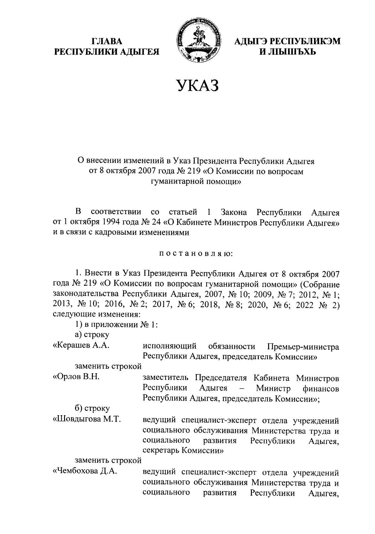 "О внесении изменений в Указ Президента Республики Адыгея от 8 октября 2007 года N 219 "О Комиссии по вопросам гуманитарной помощи"