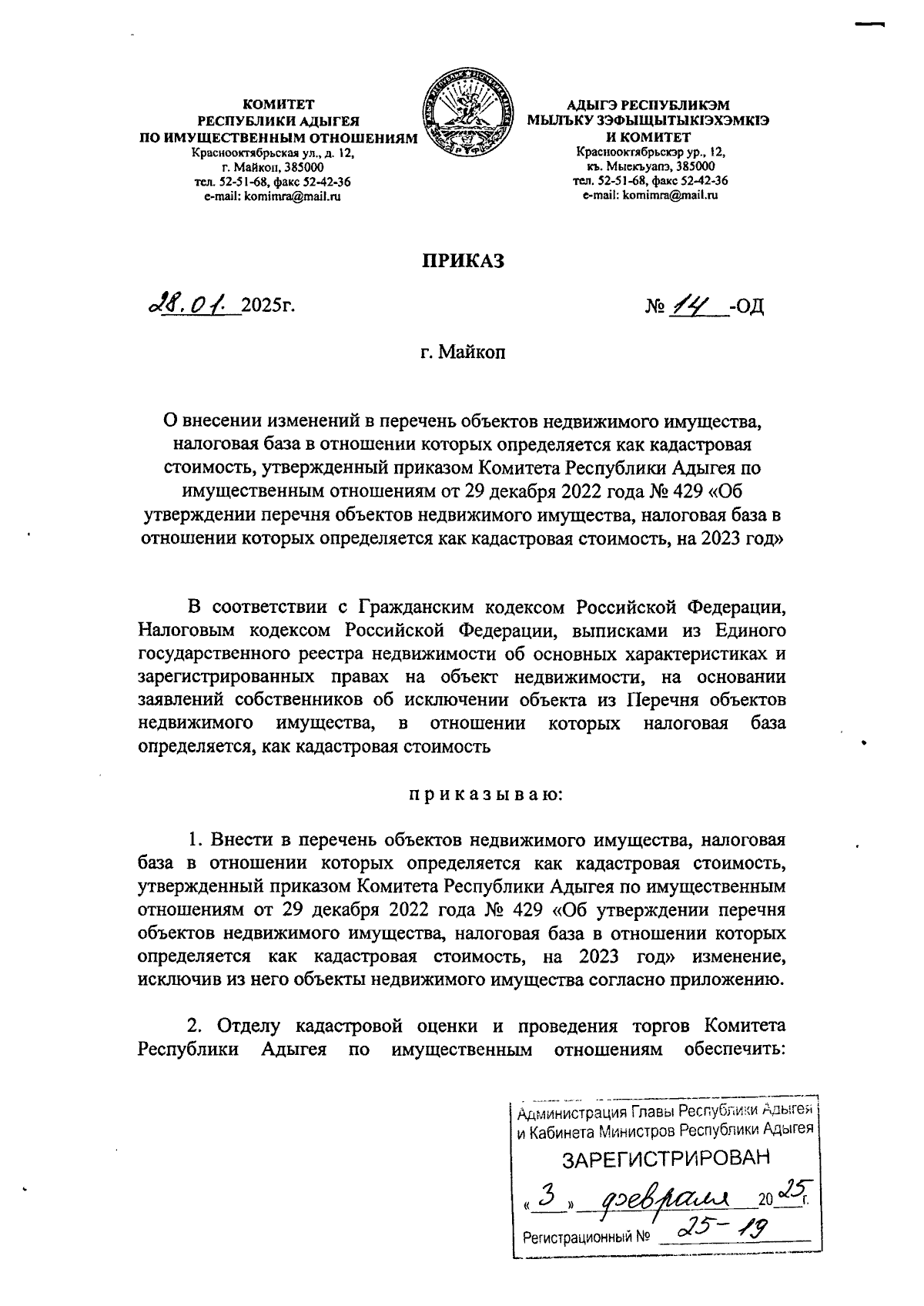 Приказ Комитета Республики Адыгея по имущественным отношениям от 28.01.2025 № 14-ОД