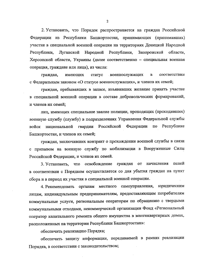 "Об утверждении Порядка освобождения в Республике Башкортостан граждан Российской Федерации, принимающих (принимавших) участие в специальной военной операции, проводимой на территориях Донецкой Народной Республики, Луганской Народной Республики, Запорожской области, Херсонской области, Украины, и членов их семей от начисления пеней в случае несвоевременного и (или) неполного внесения ими платы за жилое помещение и коммунальные услуги, взноса на капитальный ремонт общего имущества в многоквартирном доме, установленных жилищным законодательством Российской Федерации"