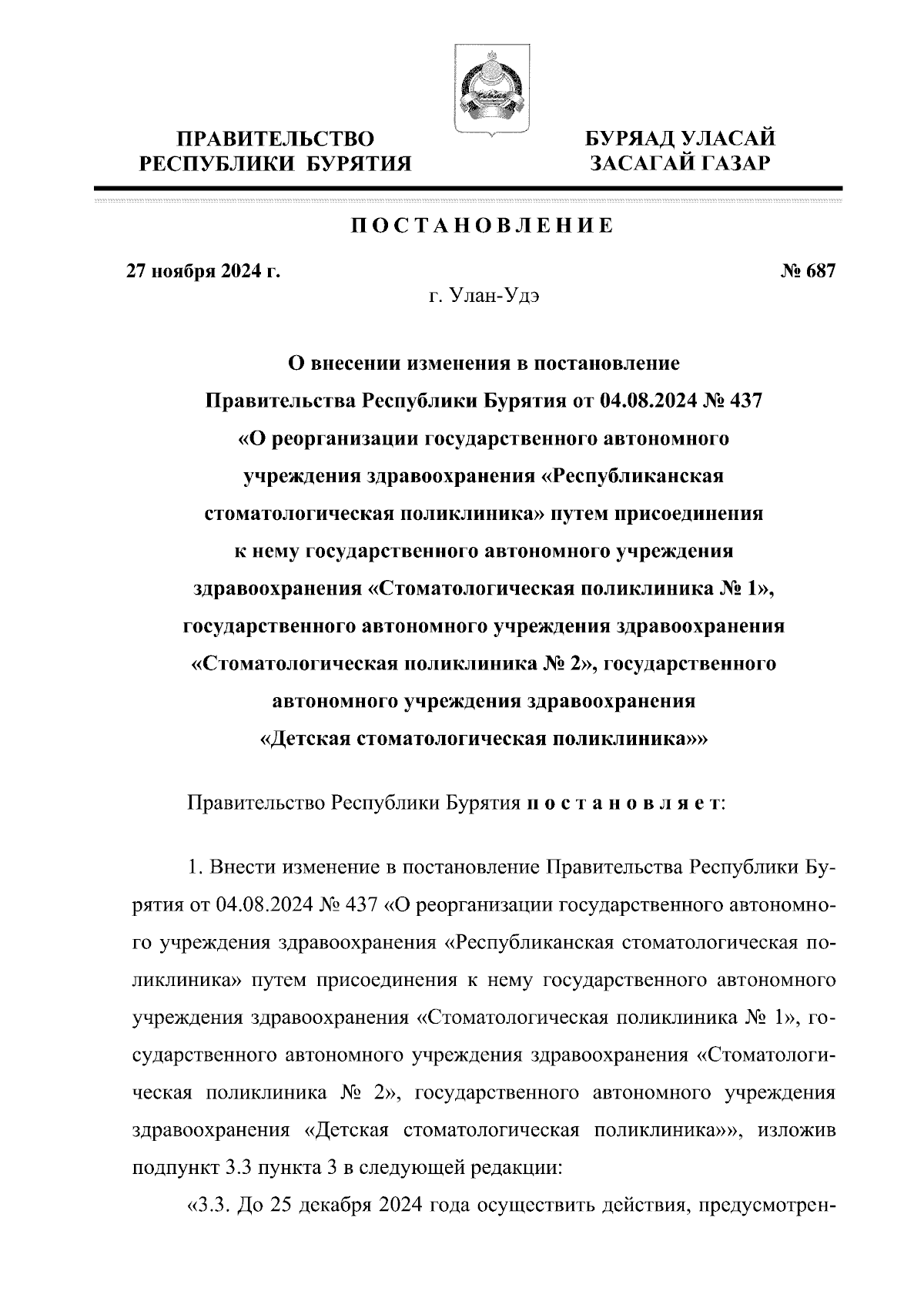 "О внесении изменения в постановление Правительства Республики Бурятия от 04.08.2024 № 437 "О реорганизации государственного автономного учреждения здравоохранения "Республиканская стоматологическая поликлиника" путем присоединения к нему государственного автономного учреждения здравоохранения "Стоматологическая поликлиника № 1", государственного автономного учреждения здравоохранения "Стоматологическая поликлиника № 2", государственного автономного учреждения здравоохранения "Детская стоматологическая поликлиника"