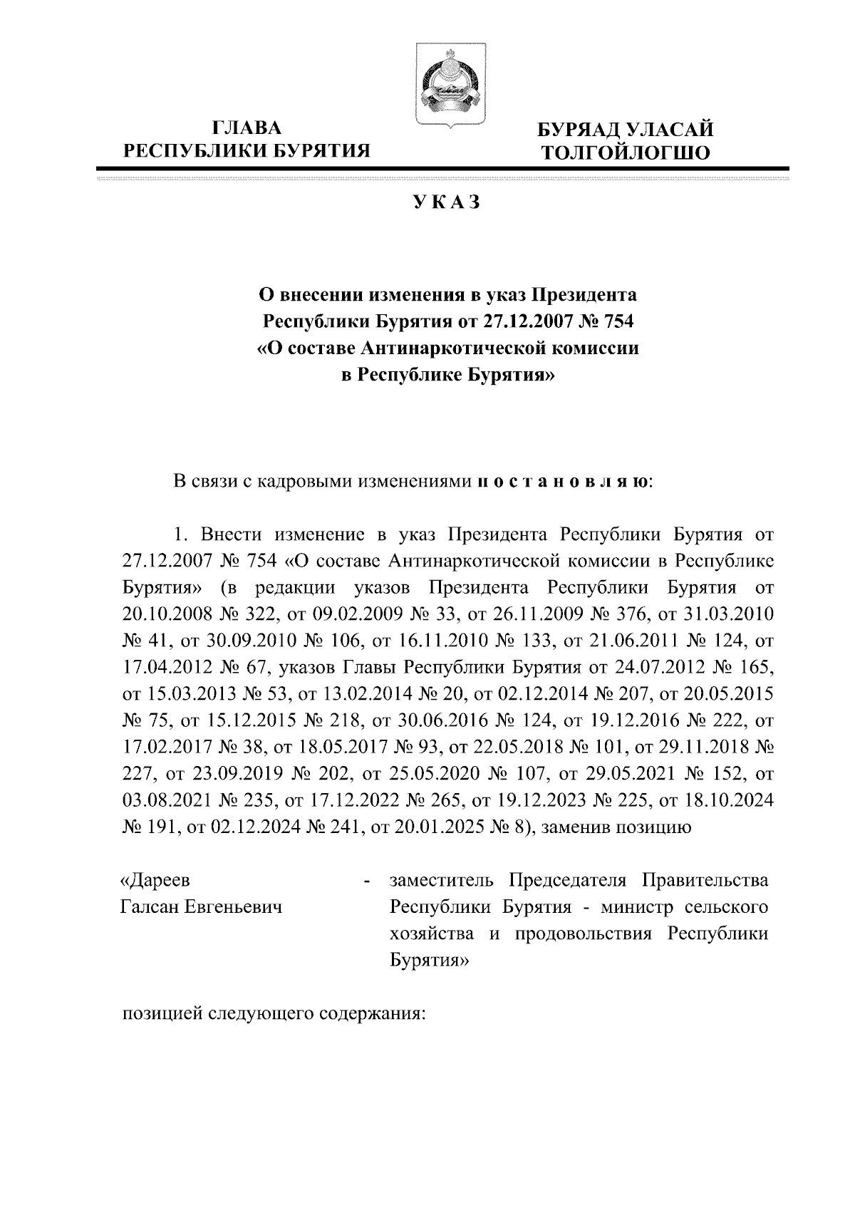 "О внесении изменения в указ Президента Республики Бурятия от 27.12.2007 № 754 "О составе Антинаркотической комиссии в Республике Бурятия"