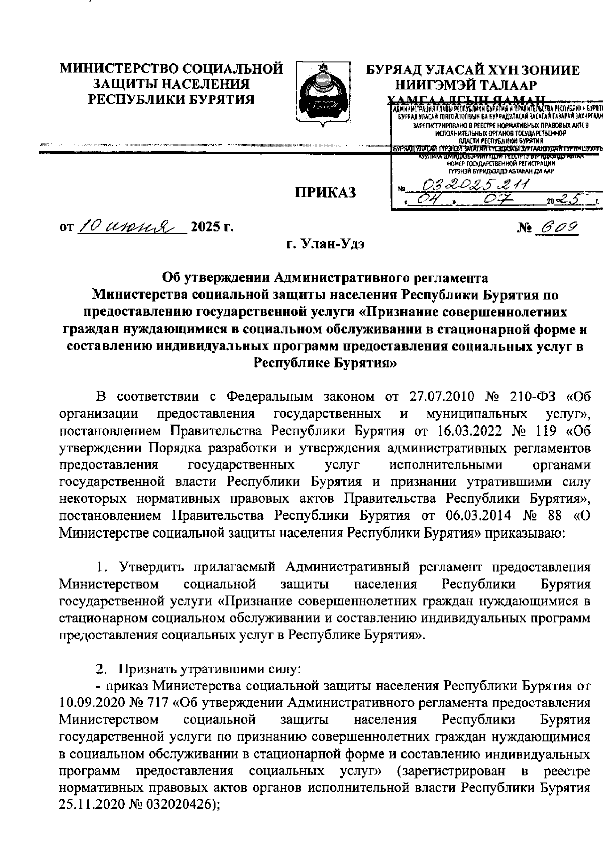 Приказ Министерства социальной защиты населения Республики Бурятия от 10.06.2025 № 609