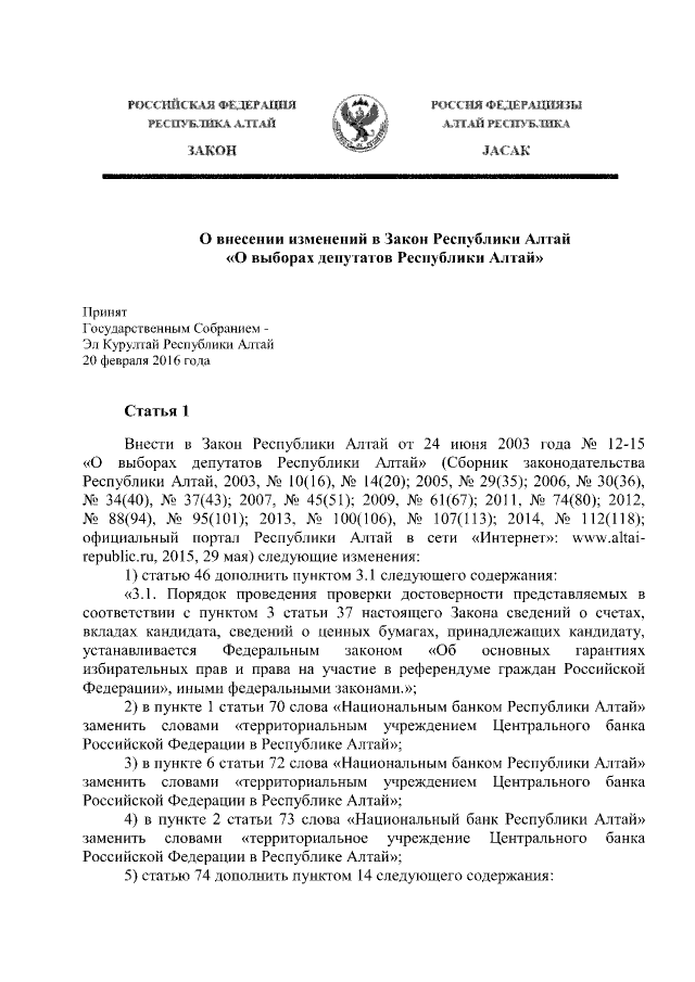 Закон Республики Алтай от 11.03.2016 № 19-РЗ "О внесении изменений в Закон Республики Алтай "О выборах депутатов Республики Алтай"