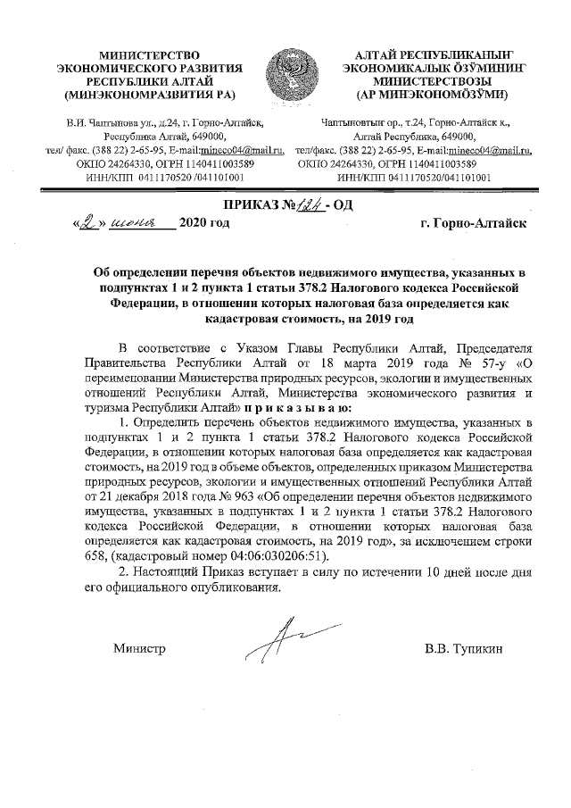 Приказ Министерства экономического развития Республики Алтай от 02.06.2020 № 124-ОД