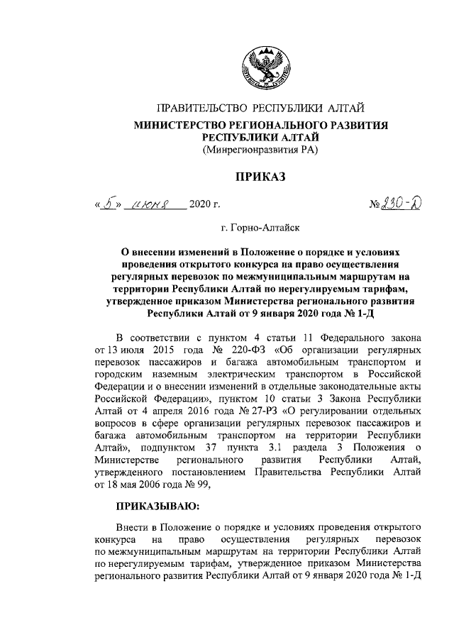 Приказ Министерства регионального развития Республики Алтай от 05.06.2020 № 230-Д
