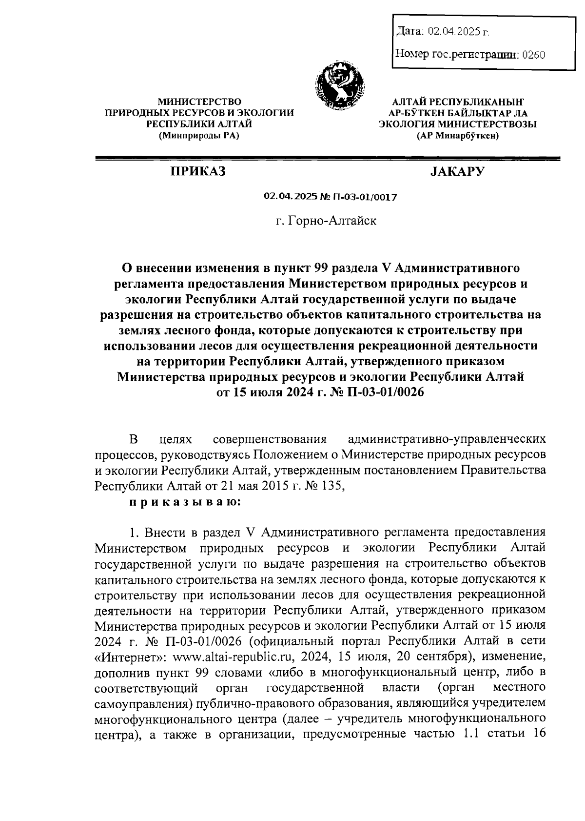 Приказ Министерства природных ресурсов и экологии Республики Алтай от 02.04.2025 № П-03-01/0017