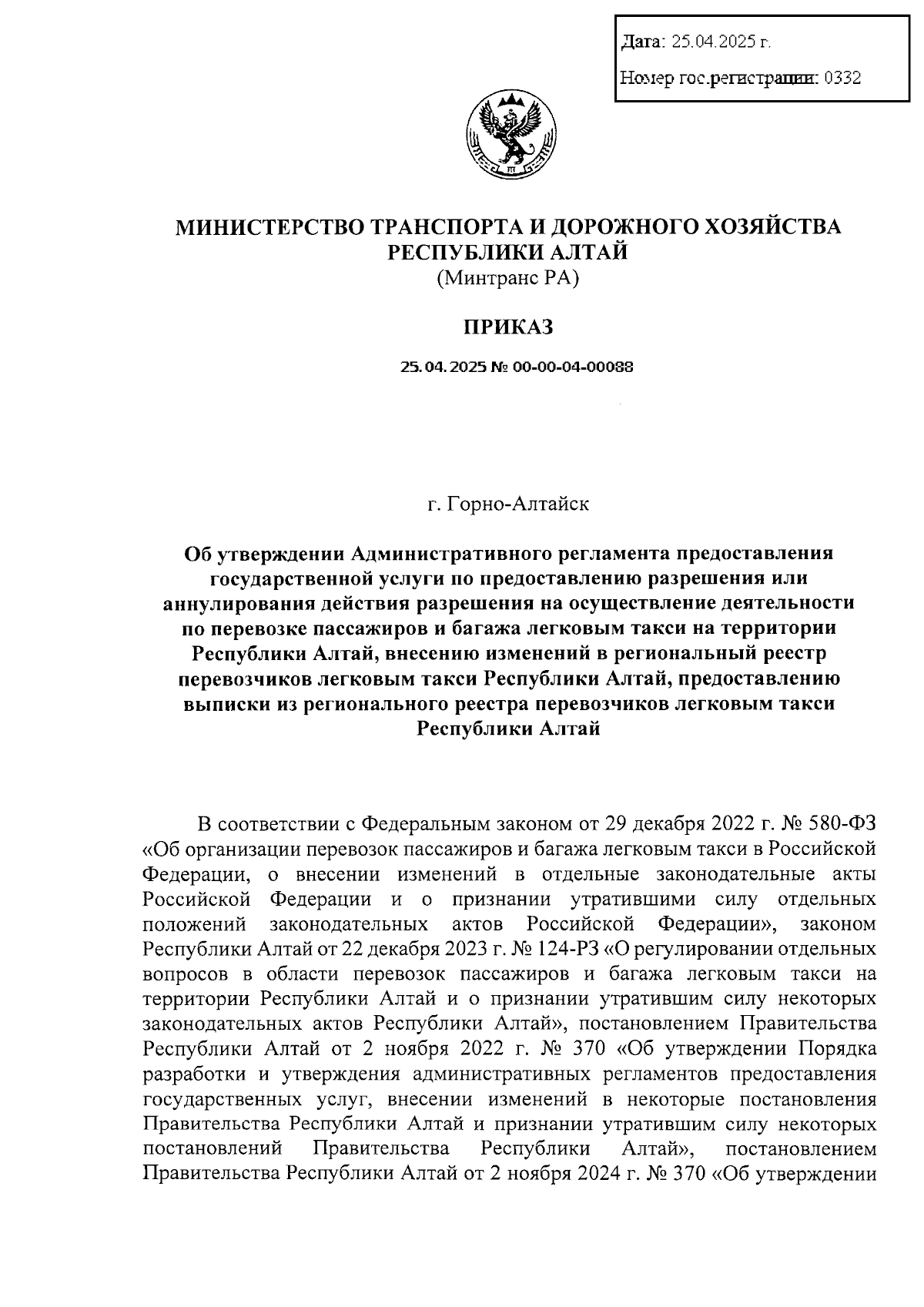 Приказ Министерства транспорта и дорожного хозяйства Республики Алтай от 25.04.2025 № 00-00-04-00088