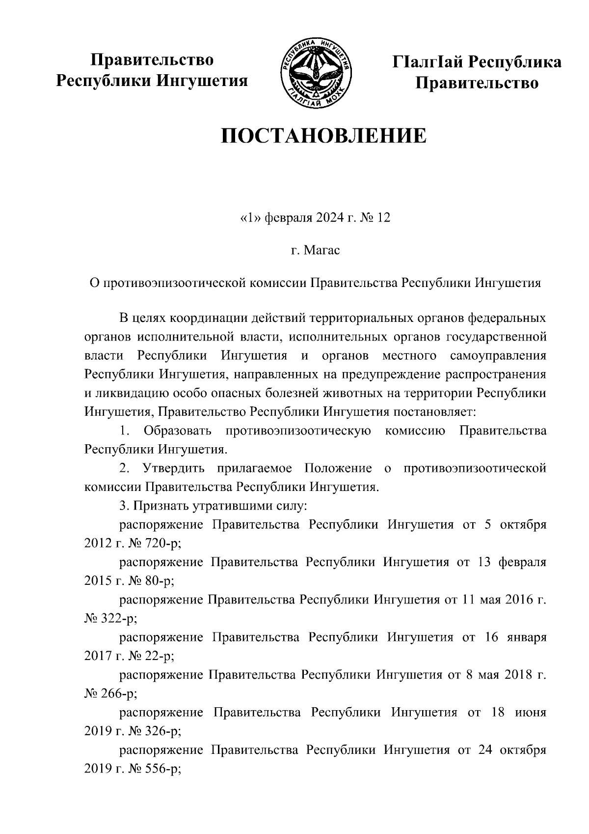 Постановление Правительства Республики Ингушетия от 01.02.2024 № 12