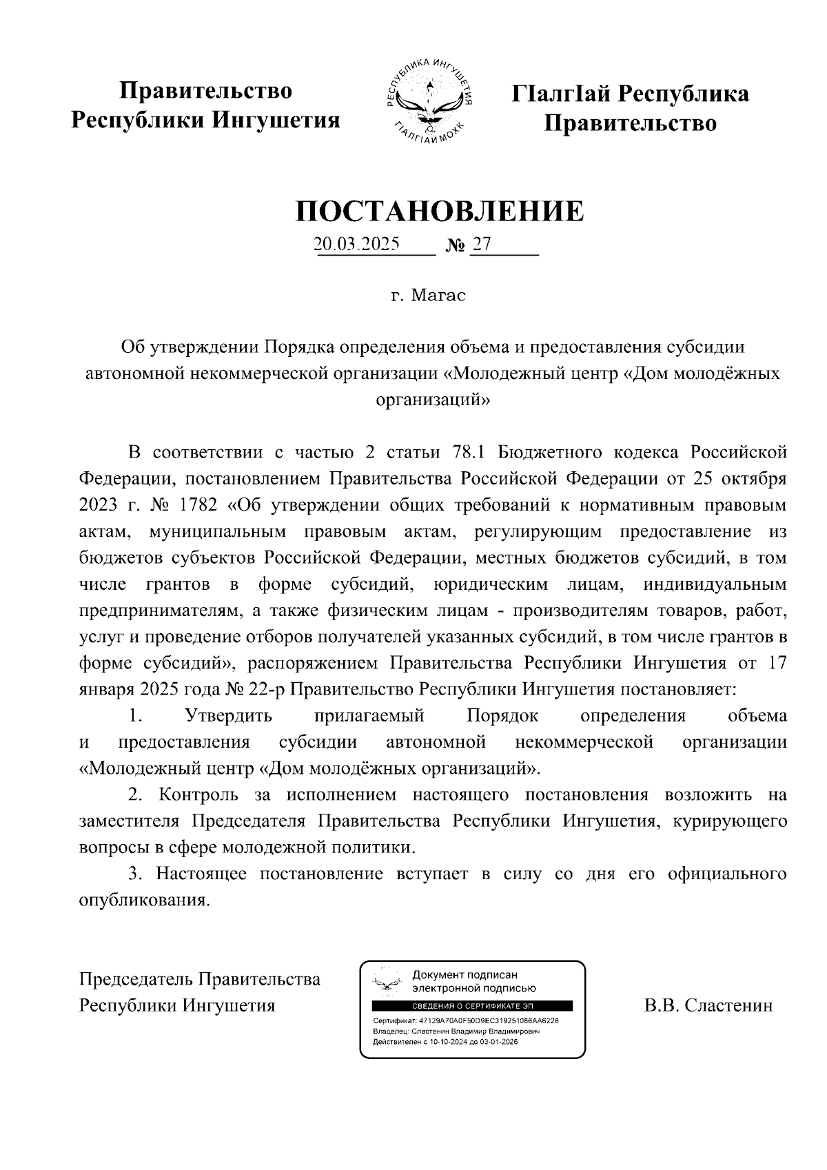 Постановление Правительства Республики Ингушетия от 20.03.2025 № 27