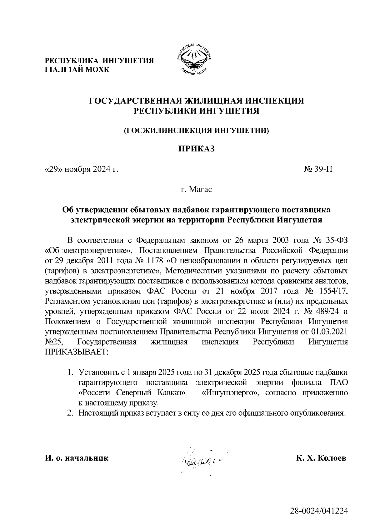 Приказ Государственной жилищной инспекции Республики Ингушетия от 29.11.2024 № 39-П