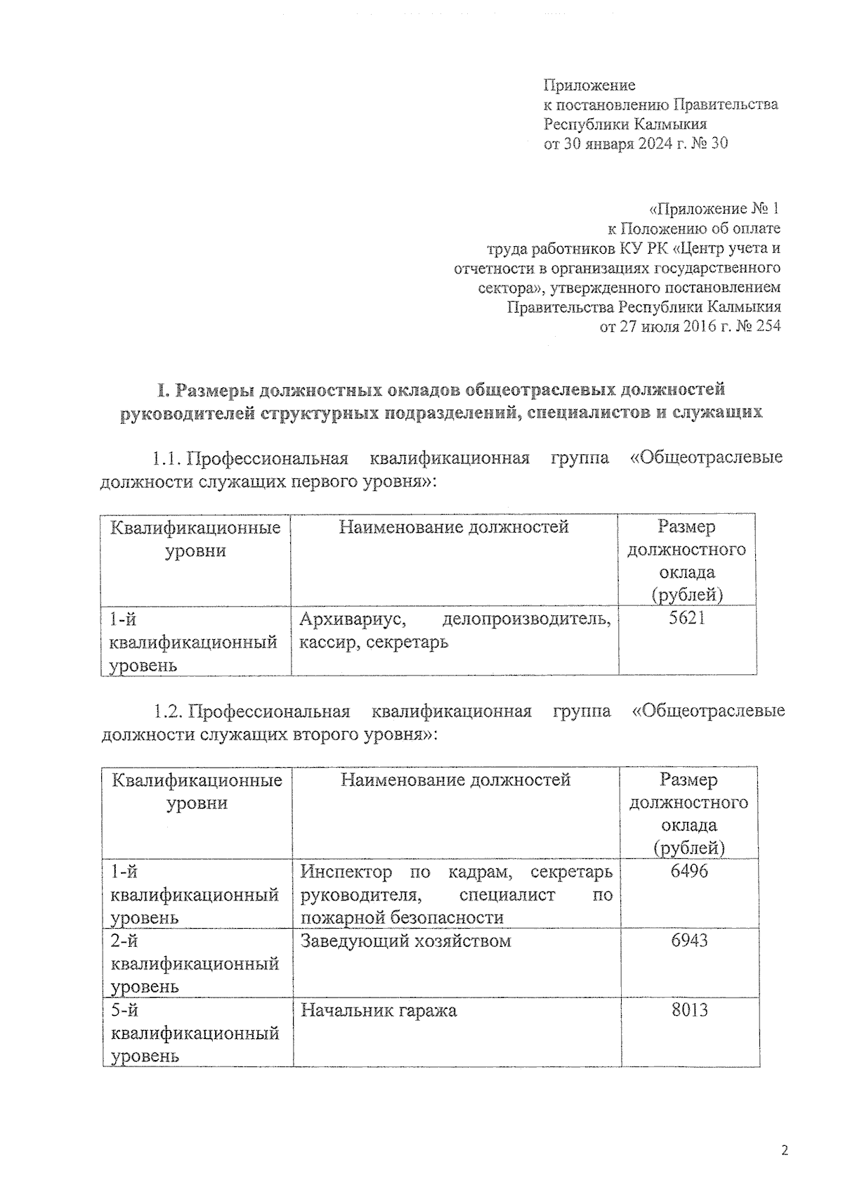"О внесении изменения в приложение № 1 к Положению об оплате труда работников казенного учреждения Республики Калмыкия "Центр учета и отчетности в организациях государственного сектора", утвержденному постановлением Правительства Республики Калмыкия от 27 июля 2016 г. № 254"
