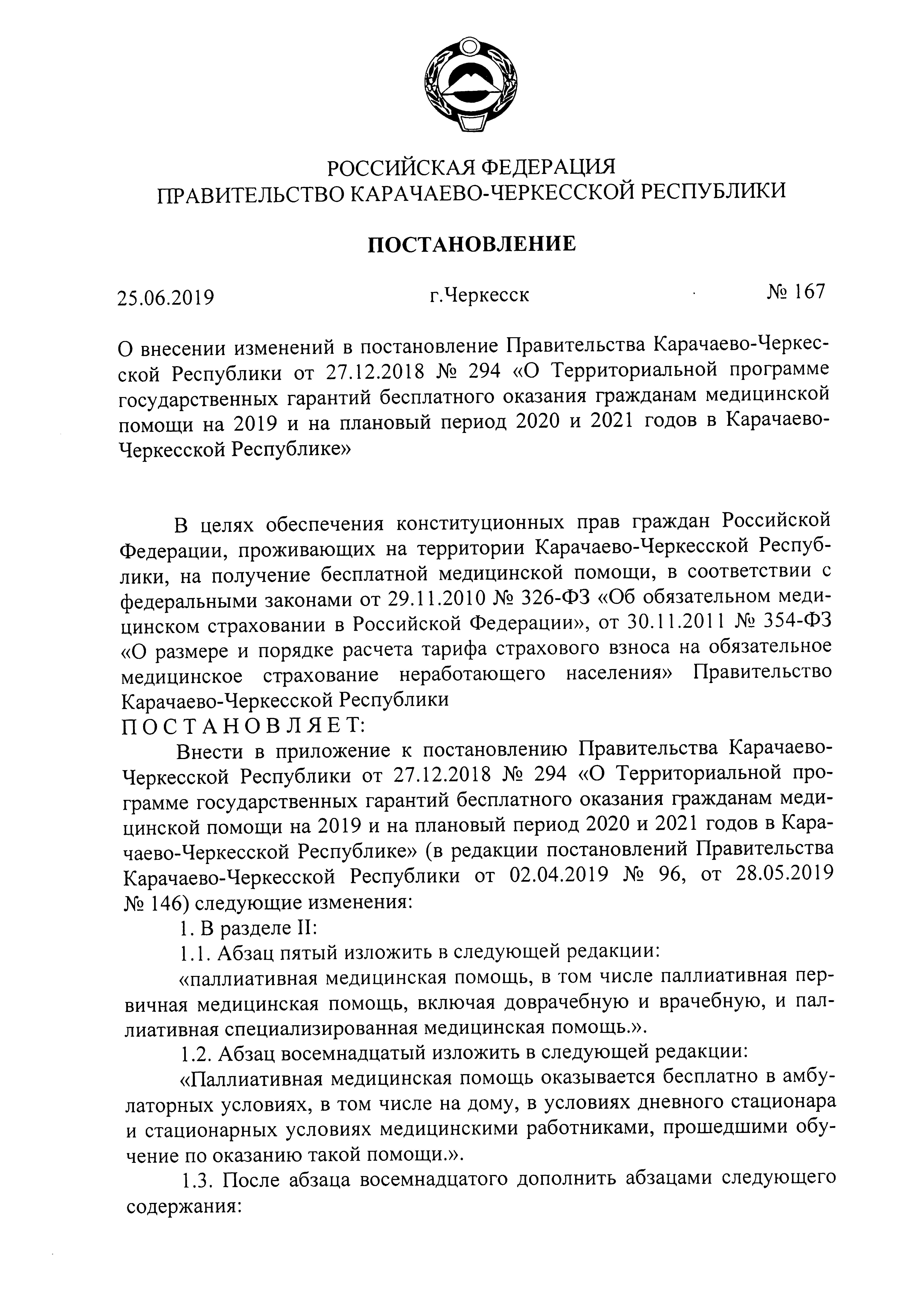 "О внесении изменений в постановление Правительства Карачаево-Черкесской Республики от 27.12.2018 № 294 "О Территориальной программе государственных гарантий бесплатного оказания гражданам медицинской помощи на 2019 и на плановый период 2020 и 2021 годов в Карачаево-Черкесской Республике"