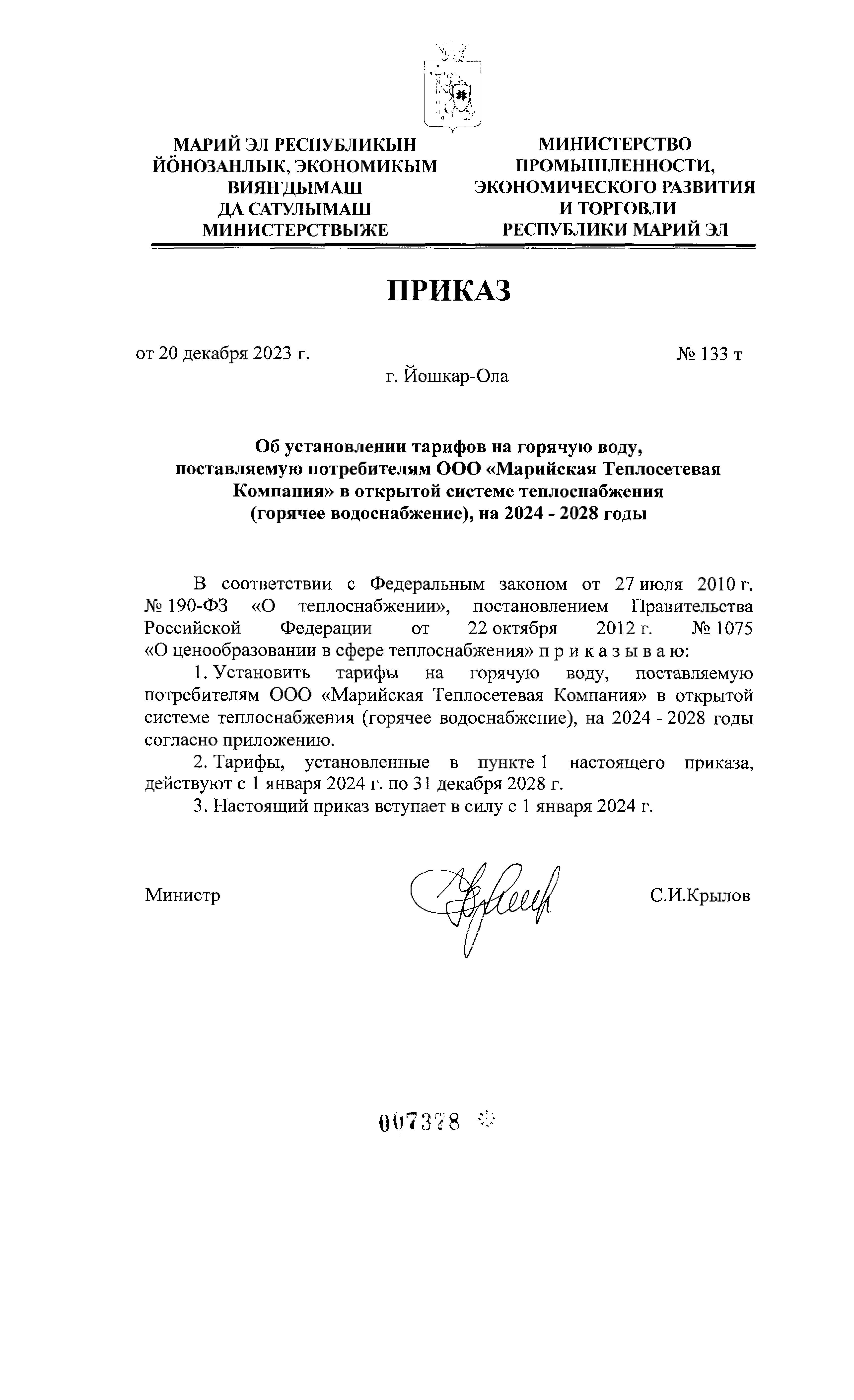 Приказ Министерства промышленности, экономического развития и торговли Республики Марий Эл от 20.12.2023 № 133 т