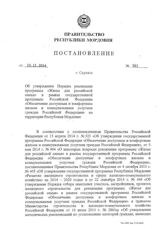 Постановление Правительства Республики Мордовия от 10.11.2014 № 551