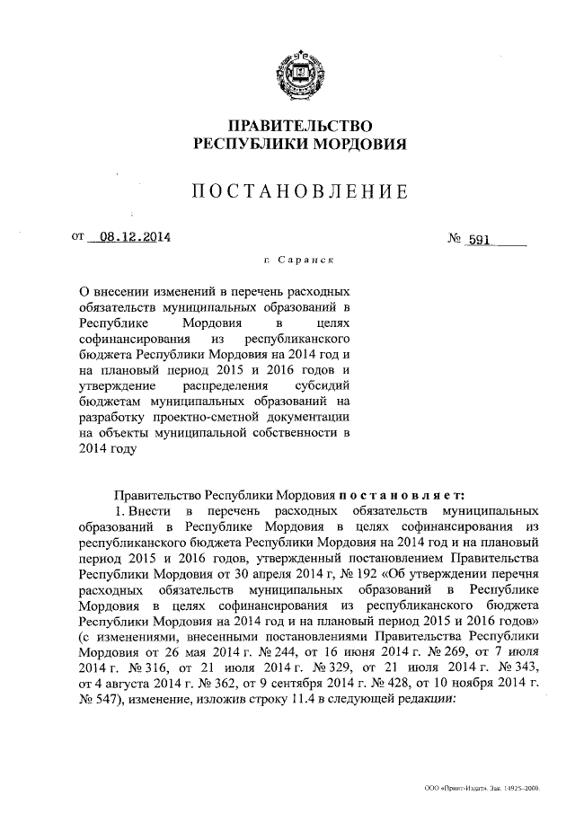 Постановление Правительства Республики Мордовия от 08.12.2014 № 591