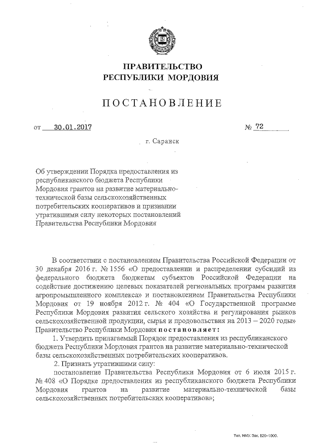 Постановление Правительства Республики Мордовия от 30.01.2017 № 72