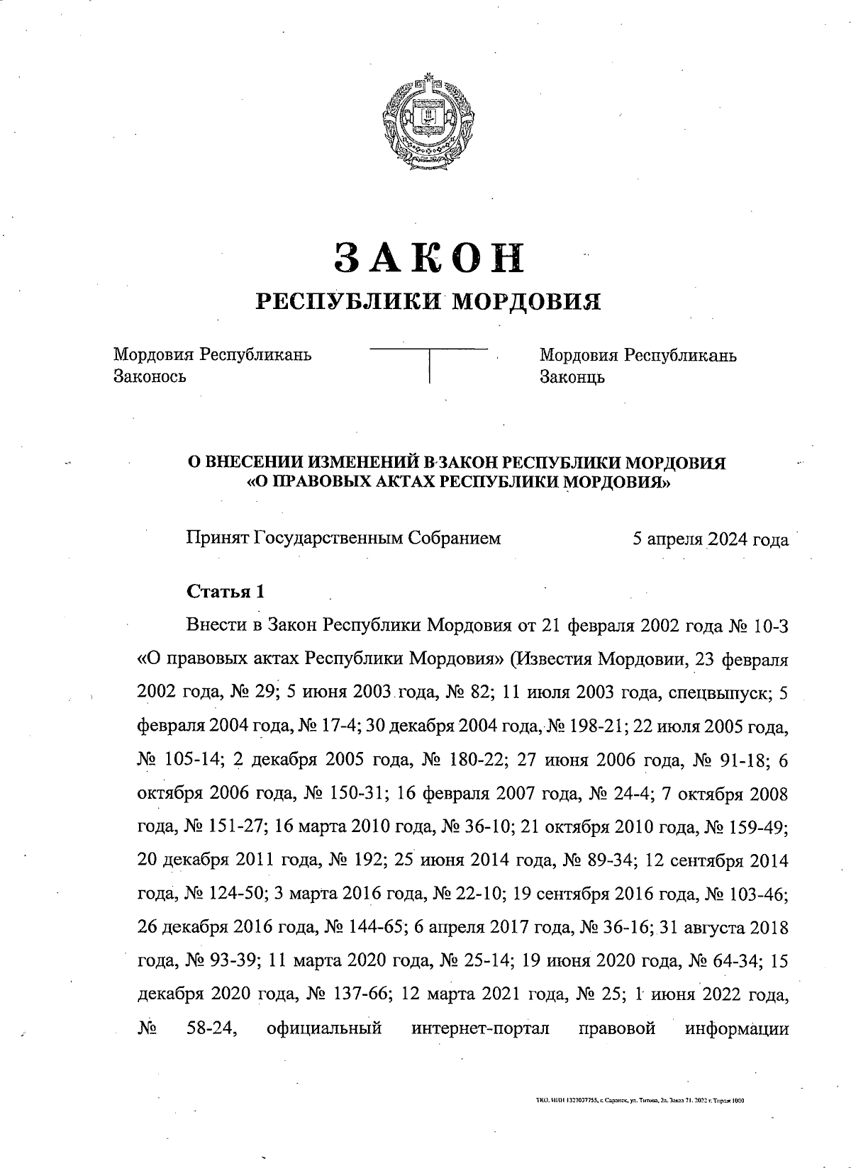"О внесении изменений в Закон Республики Мордовия "О правовых актах Республики Мордовия"
