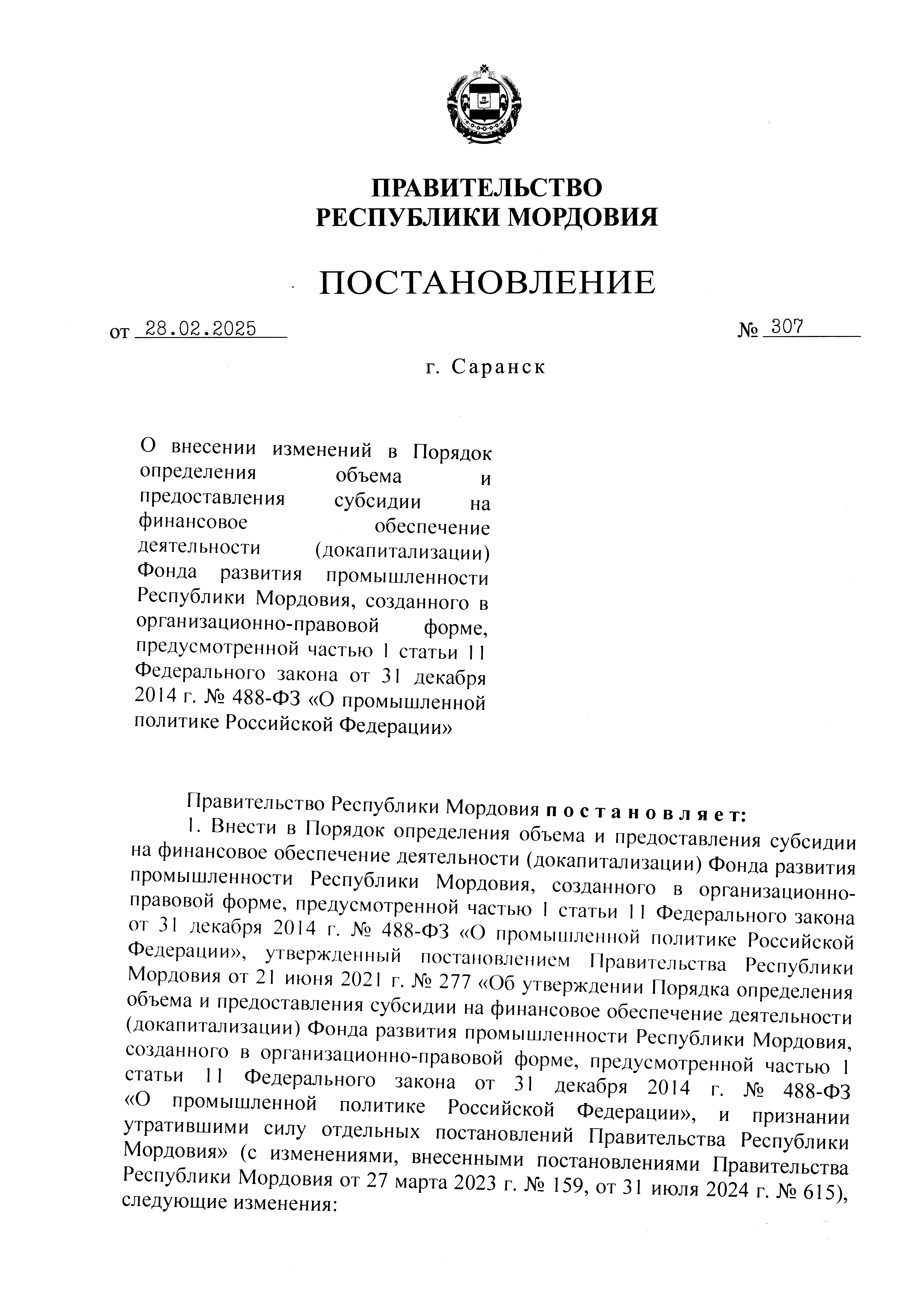 Постановление Правительства Республики Мордовия от 28.02.2025 № 307