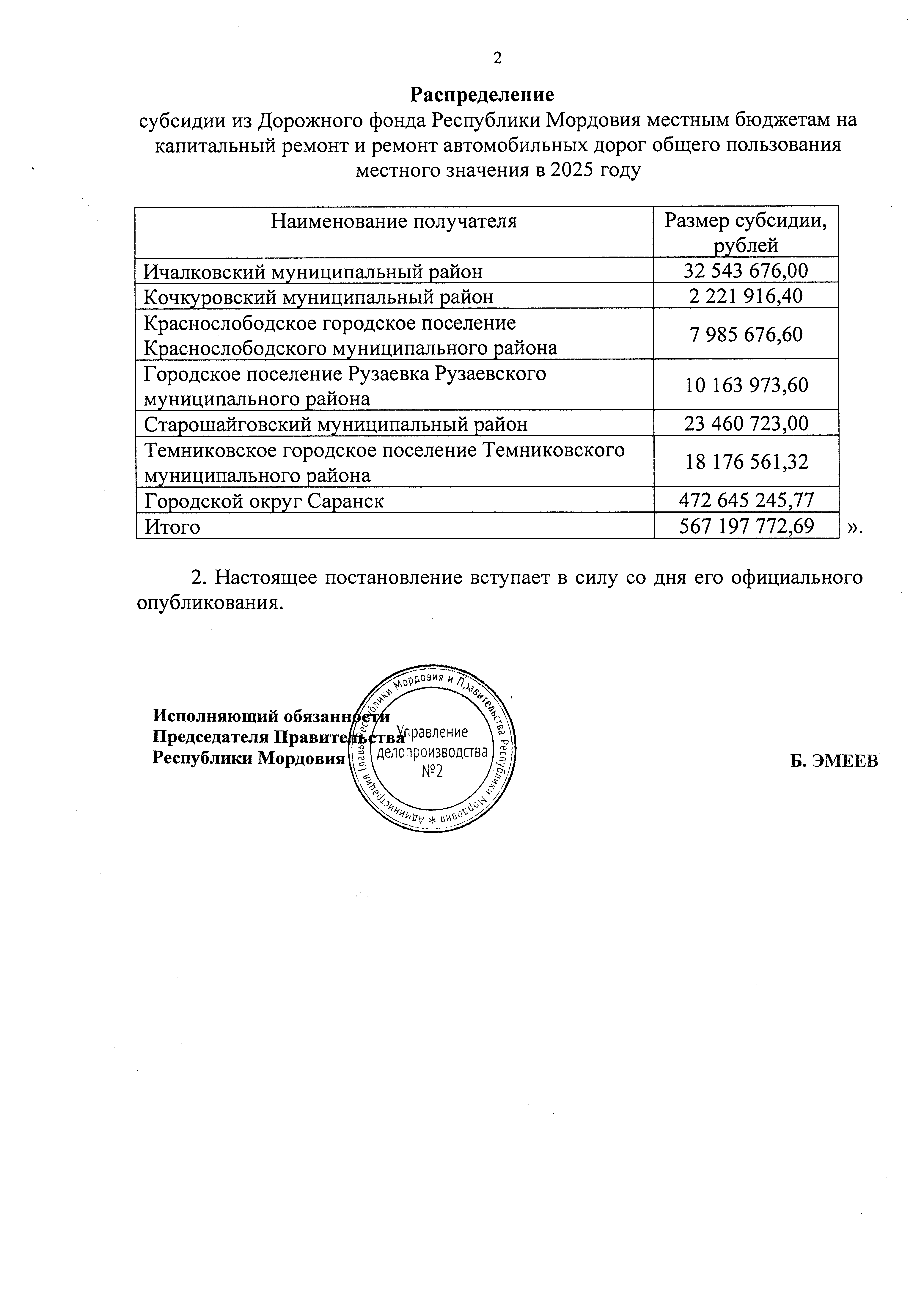 "О внесении изменения в распределение субсидии из Дорожного фонда Республики Мордовия местным бюджетам на капитальный ремонт и ремонт автомобильных дорог общего пользования местного значения в 2025 году"
