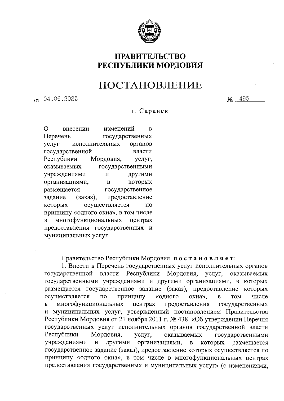 Постановление Правительства Республики Мордовия от 04.06.2025 № 495