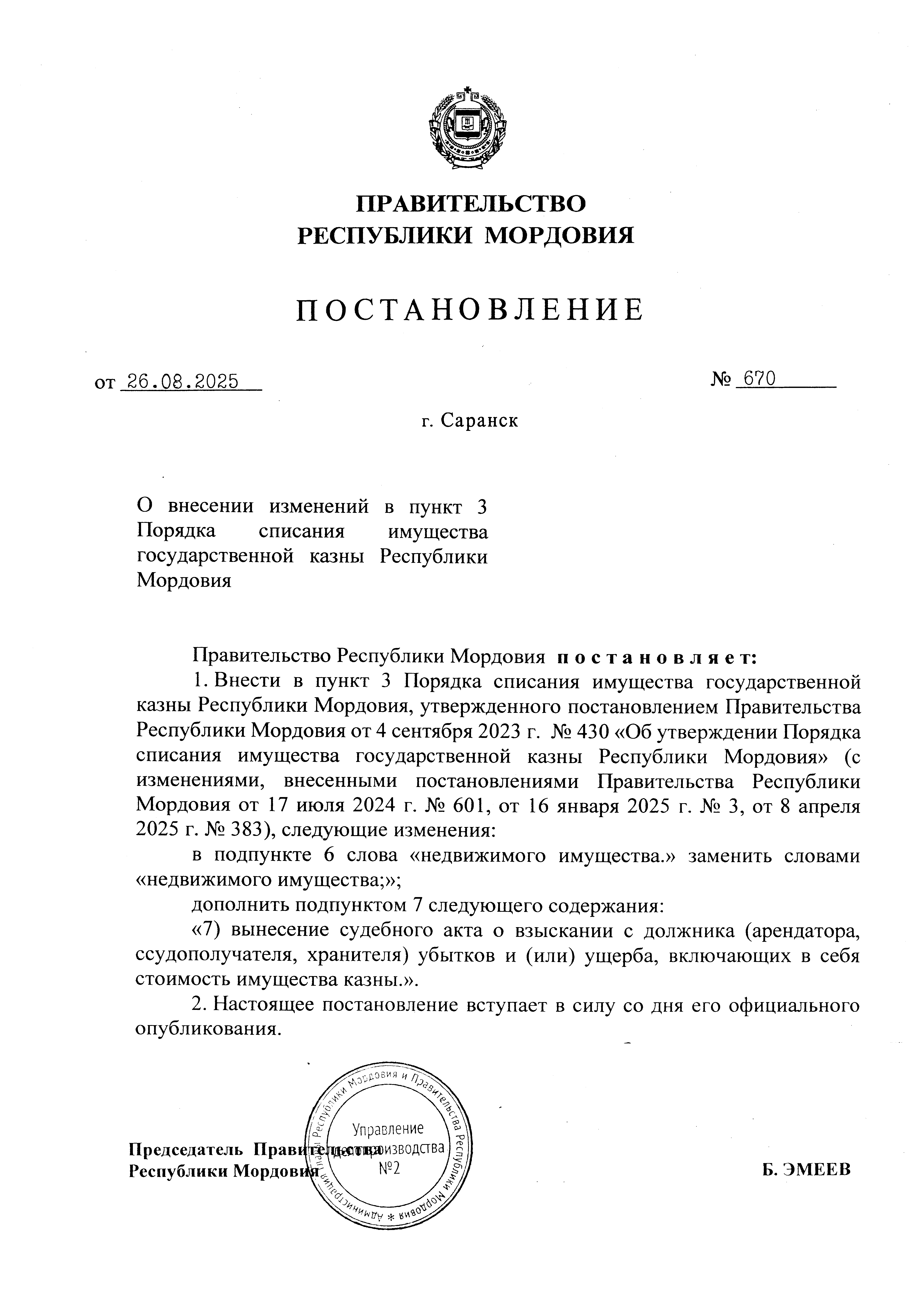 Постановление Правительства Республики Мордовия от 26.08.2025 № 670