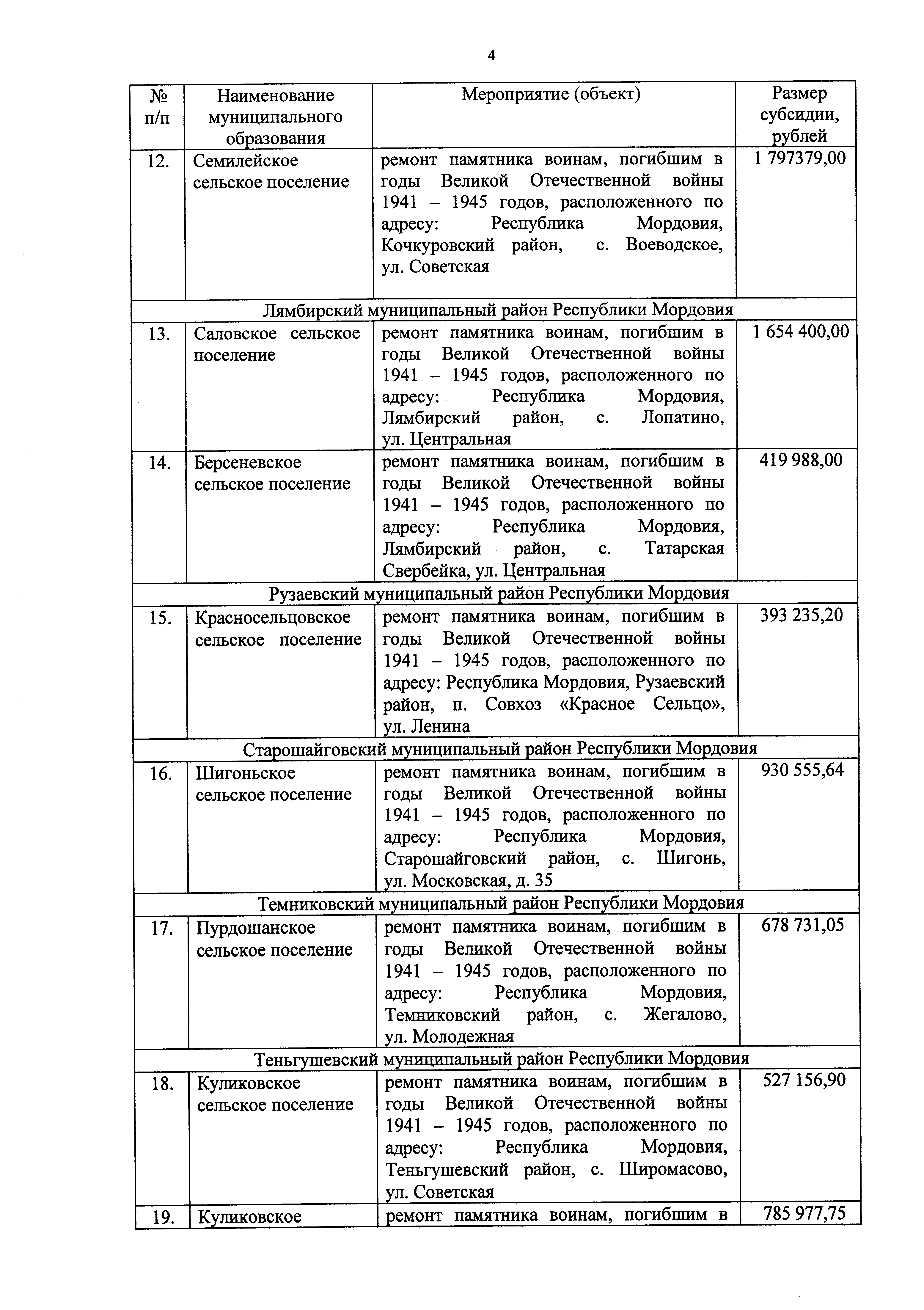 "О внесении изменения в распределение субсидий из республиканского бюджета Республики Мордовия бюджетам муниципальных образований в Республике Мордовия на софинансирование мероприятий по благоустройству территорий муниципальных образований (в части изготовления, установки, капитального ремонта и ремонта памятников воинам, погибшим в годы Великой Отечественной войны 1941 – 1945 годов) на 2025 год"