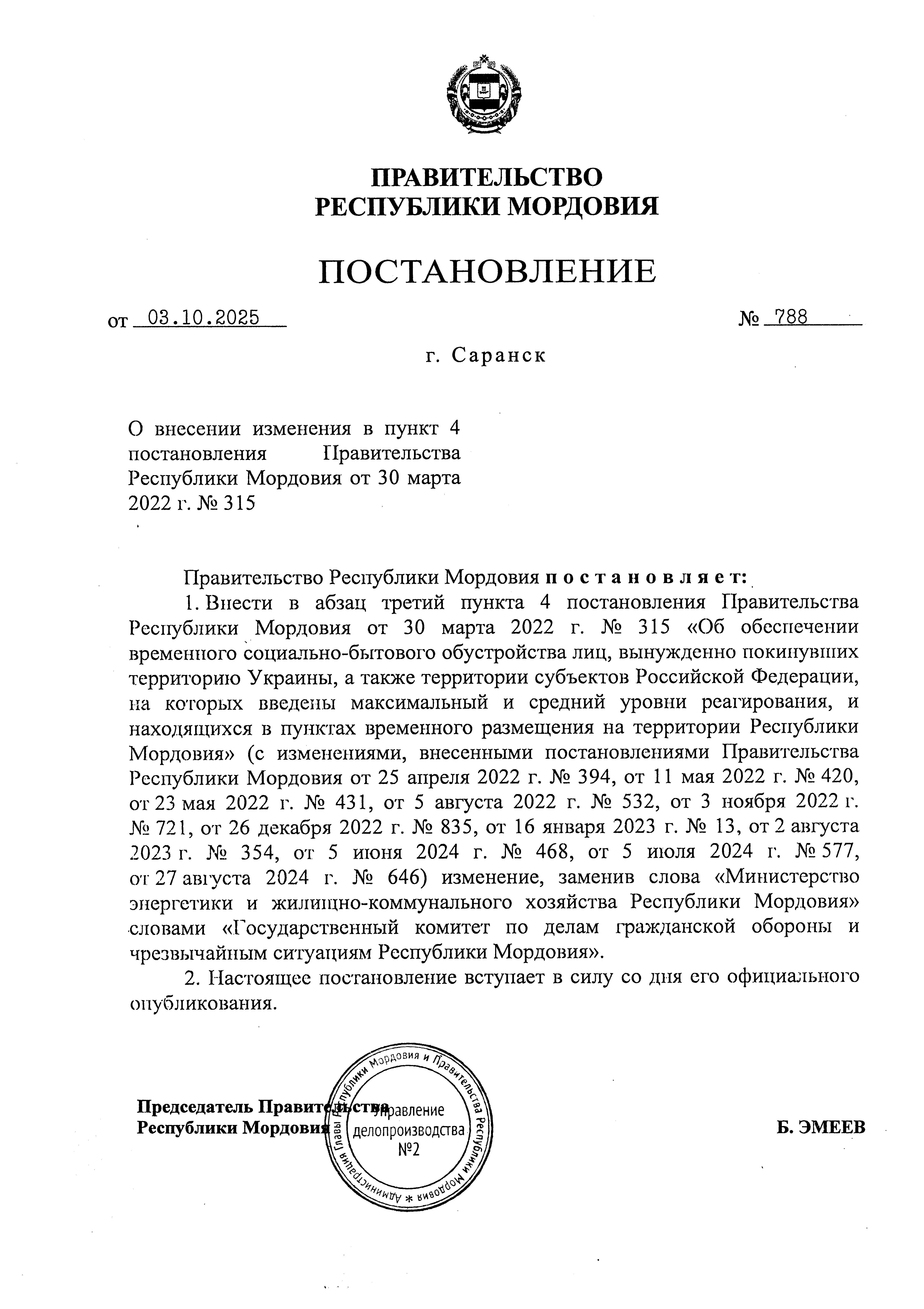 Постановление Правительства Республики Мордовия от 03.10.2025 № 788