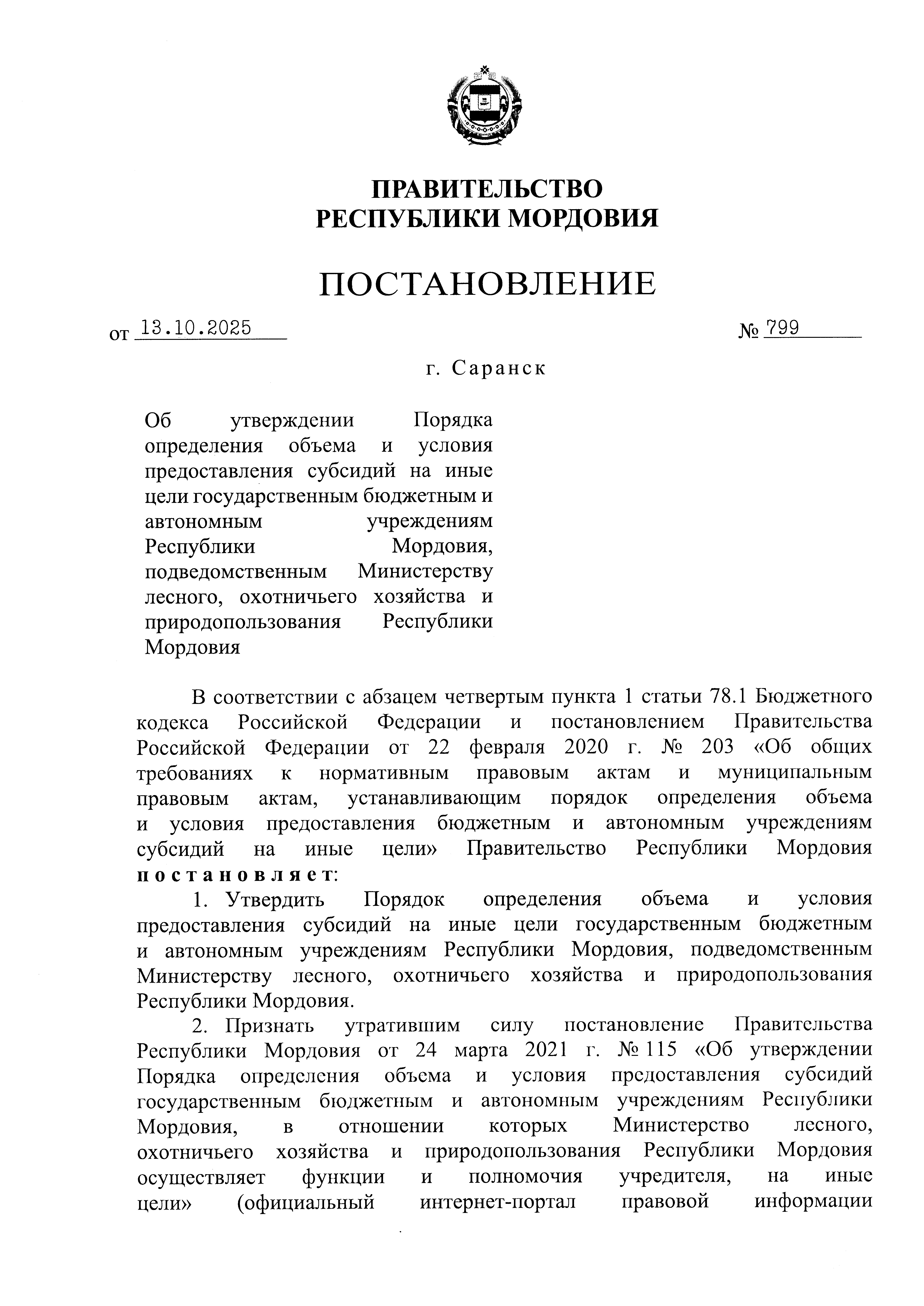 Постановление Правительства Республики Мордовия от 13.10.2025 № 799
