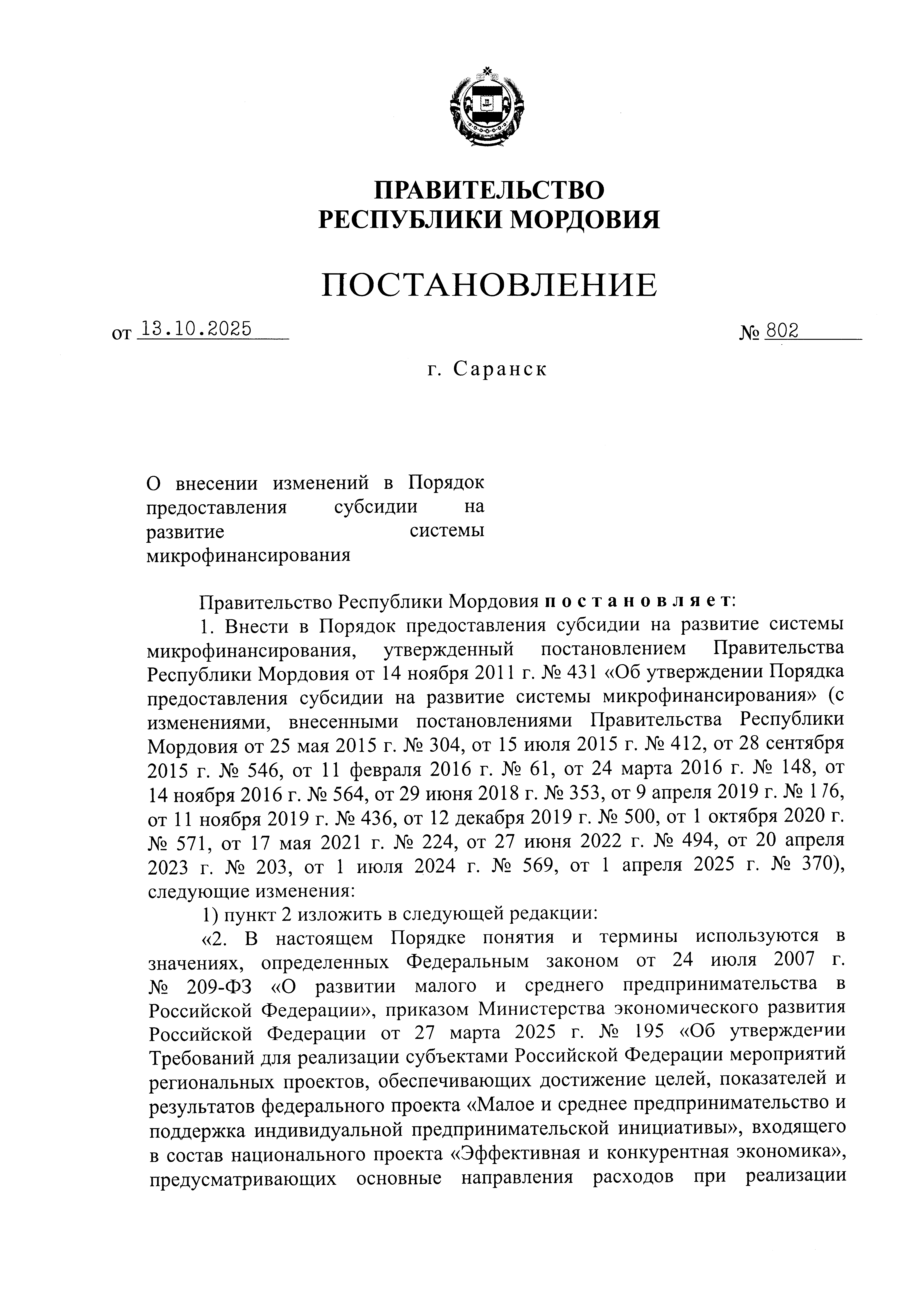 Постановление Правительства Республики Мордовия от 13.10.2025 № 802