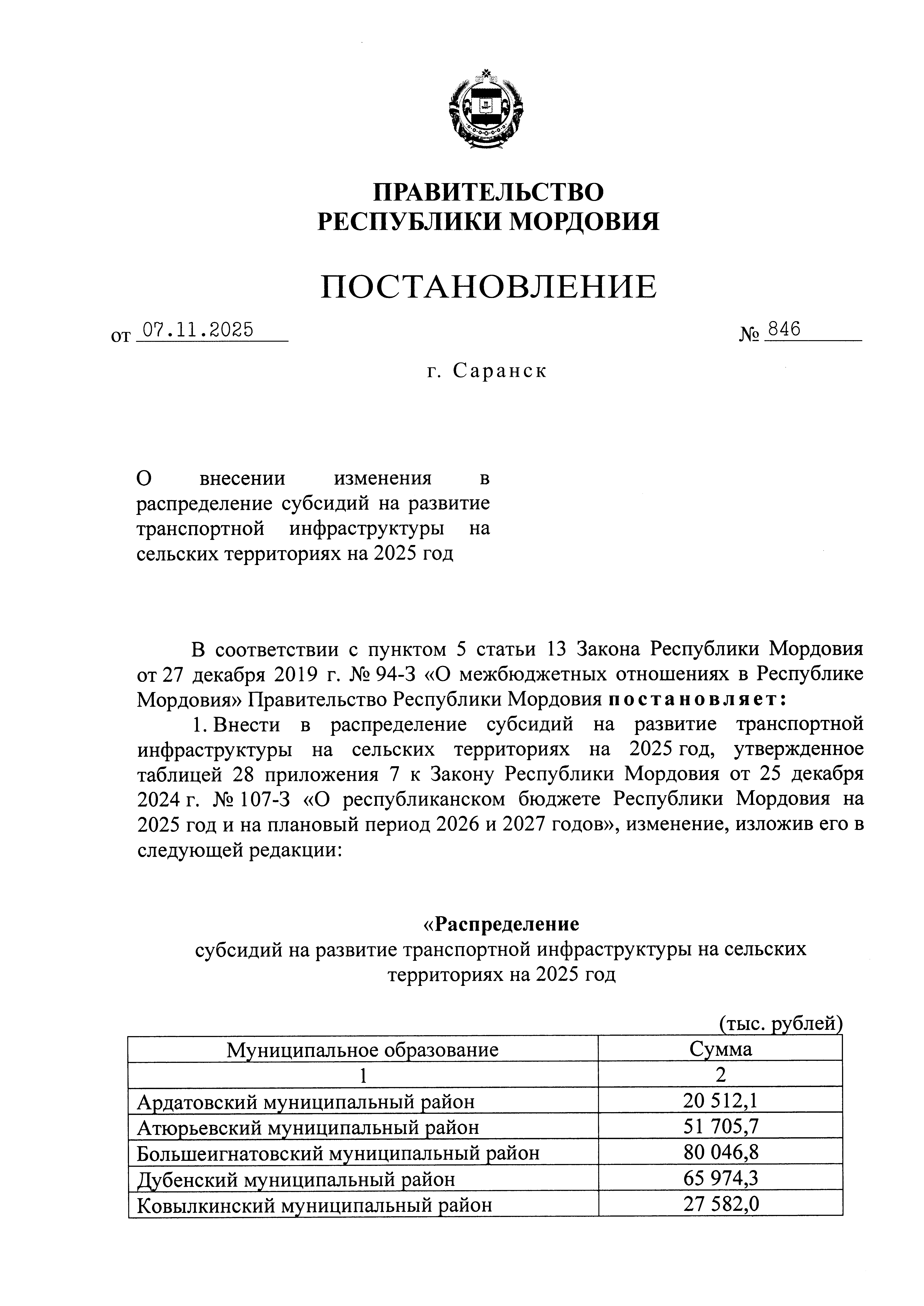 Постановление Правительства Республики Мордовия от 07.11.2025 № 846