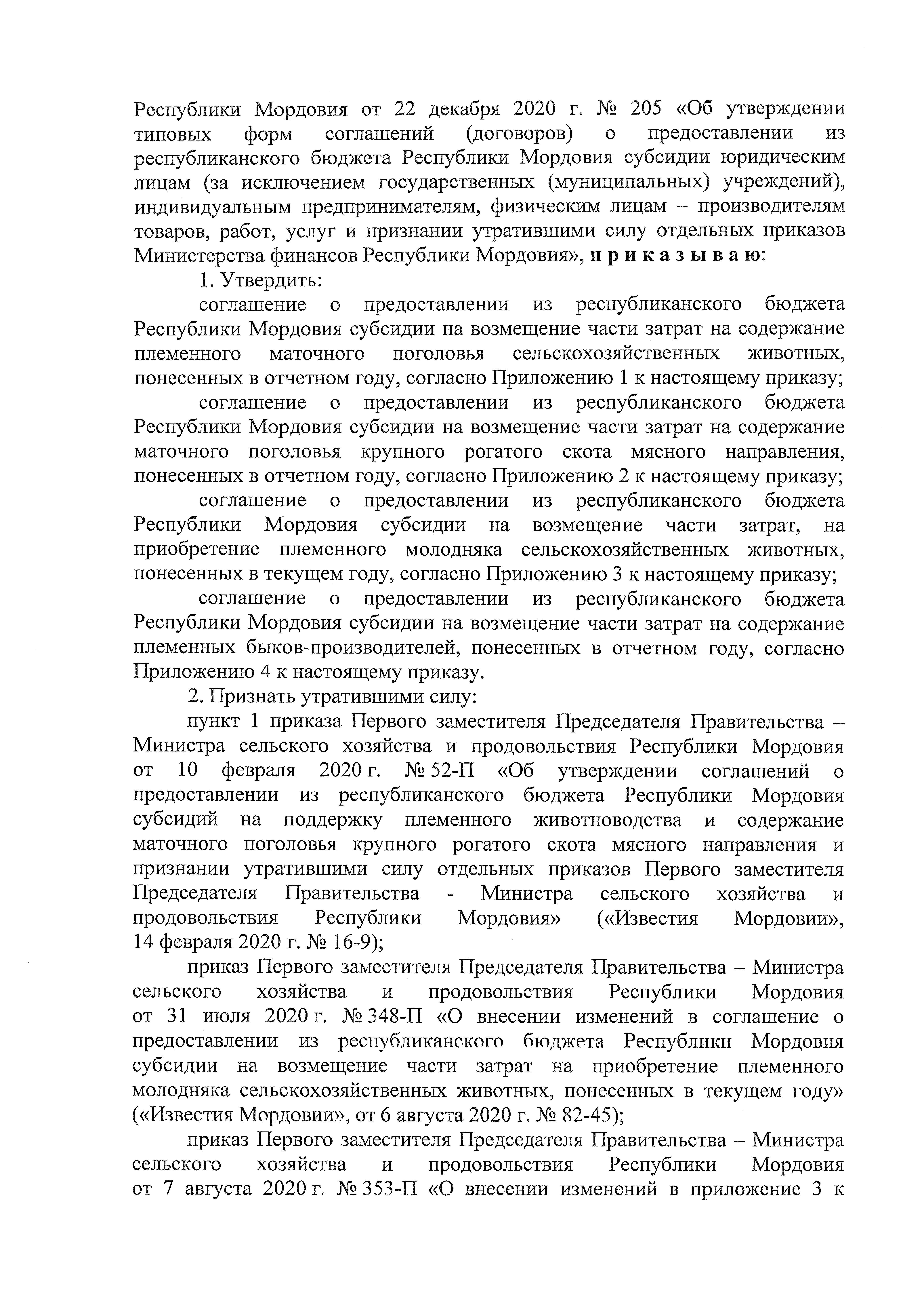 "Об утверждении соглашений о предоставлении из республиканского бюджета Республики Мордовия субсидий на поддержку племенного животноводства и содержание маточного поголовья крупного рогатого скота мясного направления и признании утратившими силу отдельных приказов Первого заместителя Председателя Правительства – Министра сельского хозяйства и продовольствия Республики Мордовия"