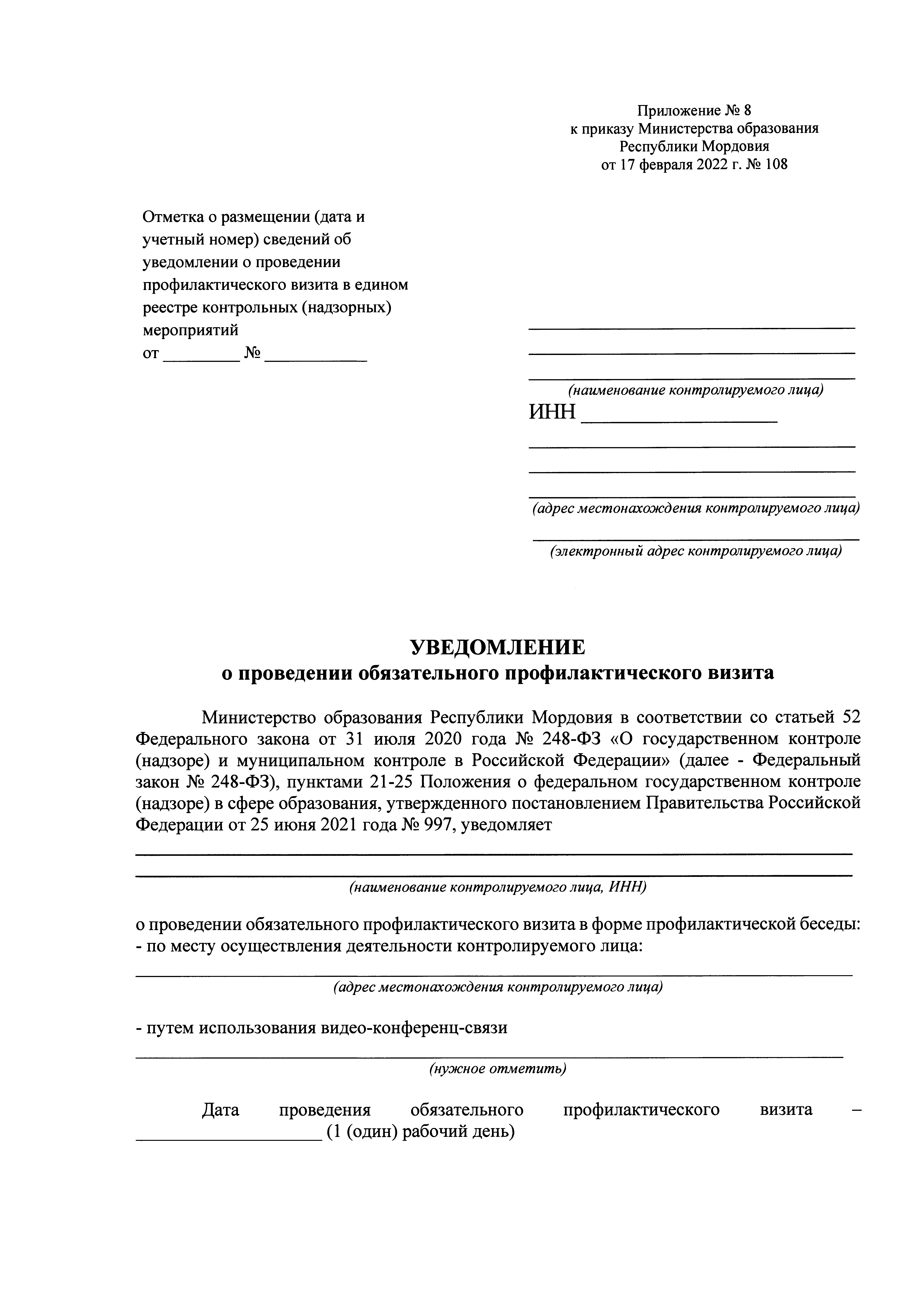 Приказ Министерства образования Республики Мордовия от 17.02.2022 № 108