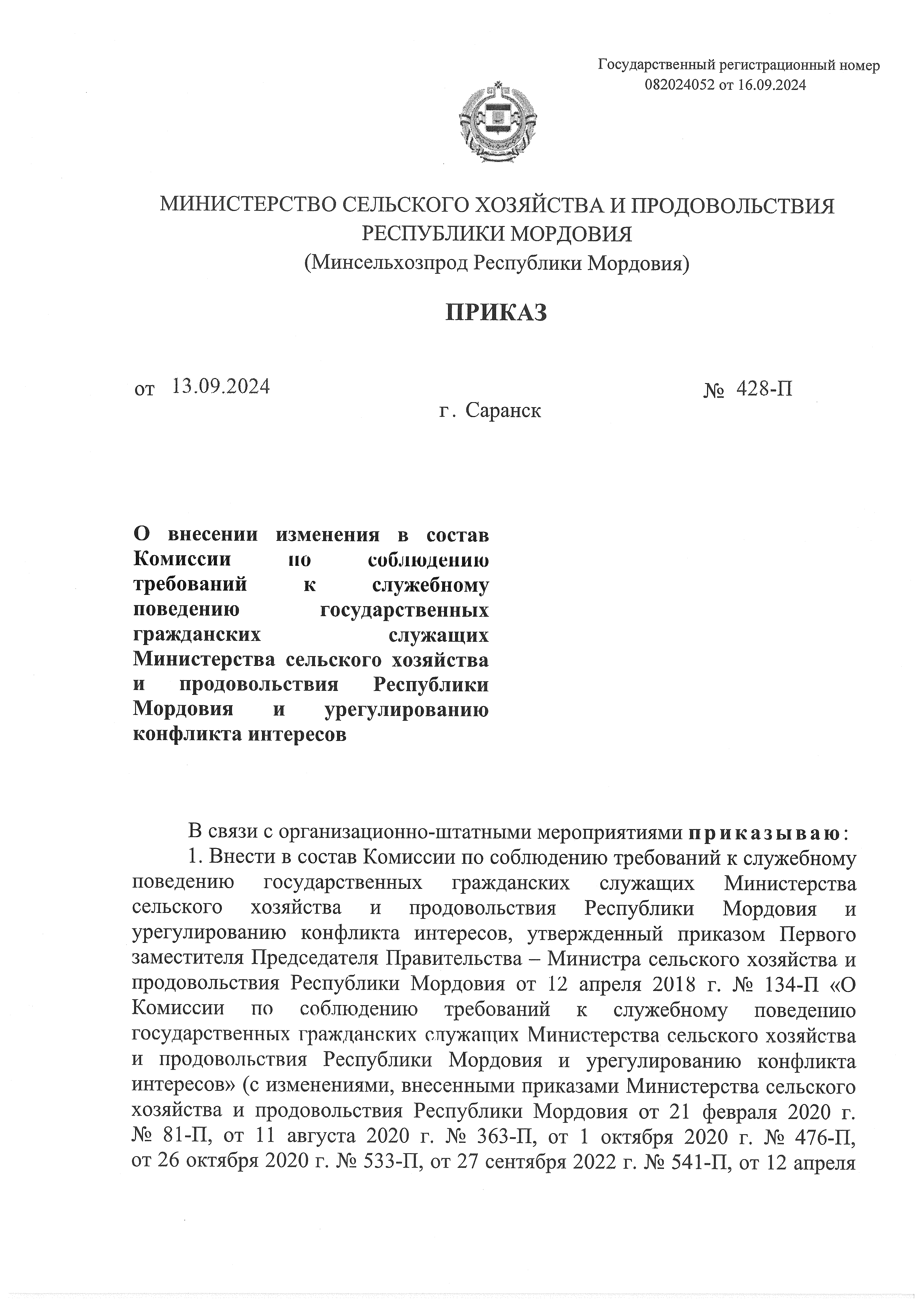 Приказ Министерства сельского хозяйства и продовольствия Республики Мордовия от 13.09.2024 № 428-П