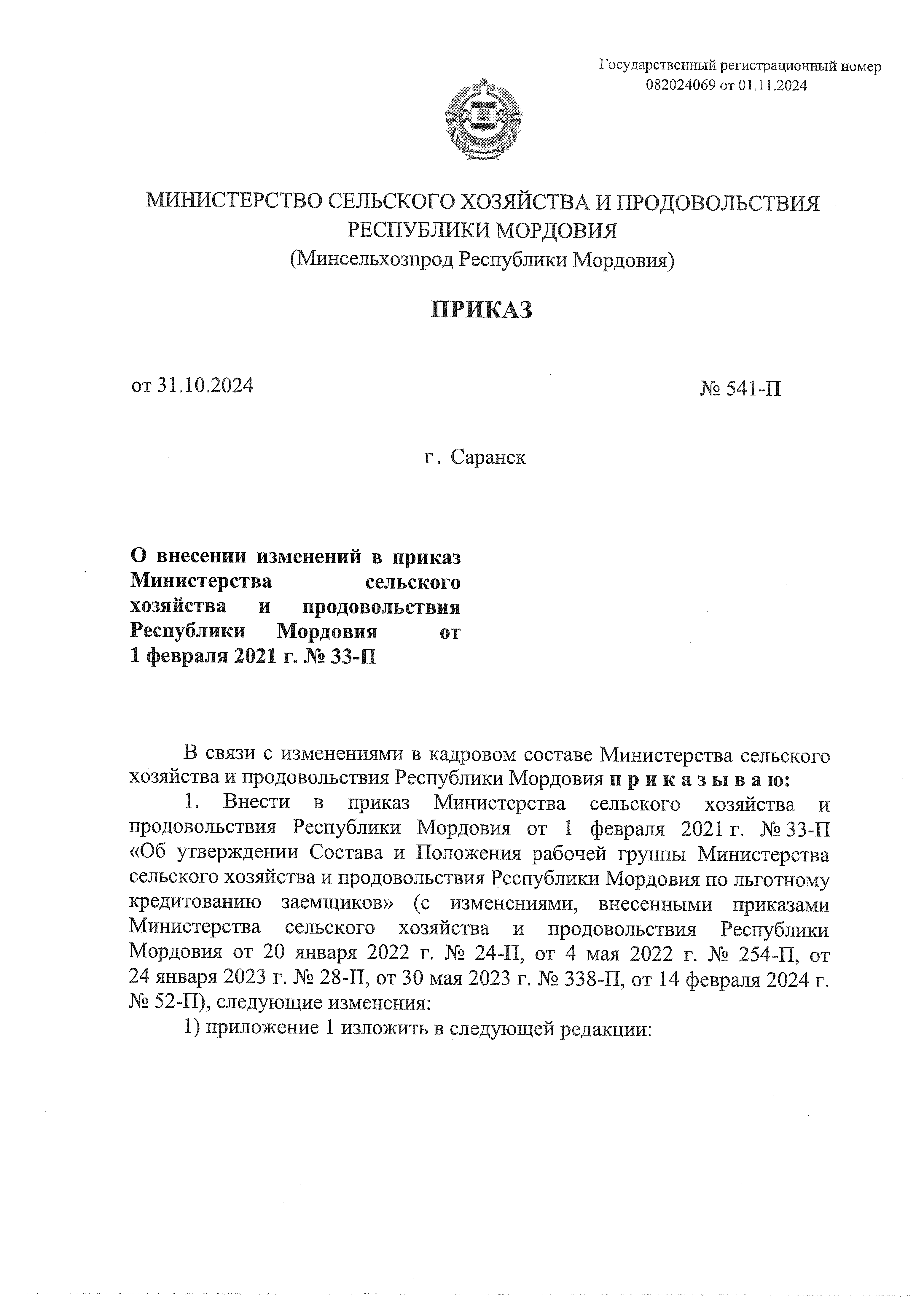 Приказ Министерства сельского хозяйства и продовольствия Республики Мордовия от 31.10.2024 № 541-П