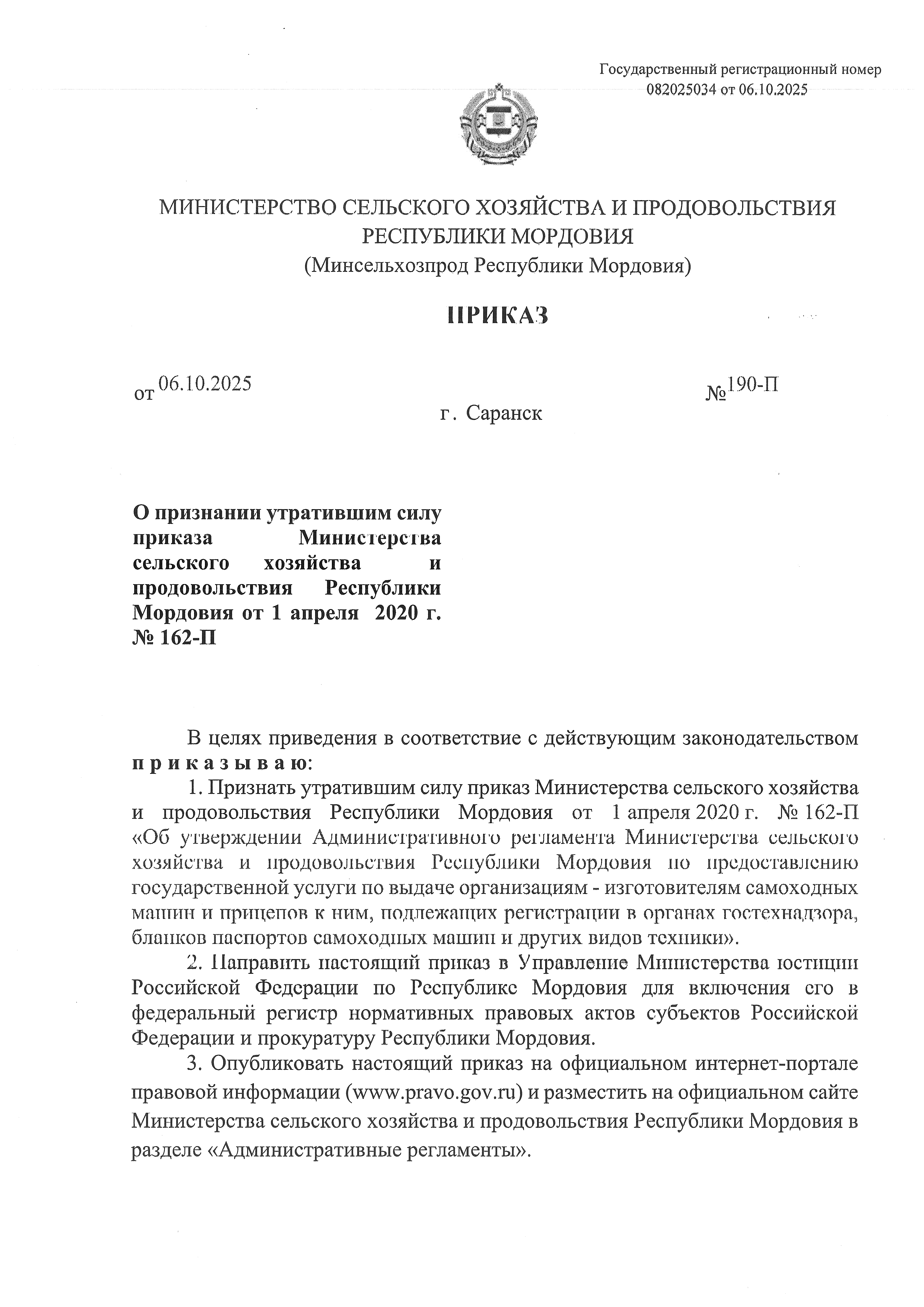 Приказ Министерства сельского хозяйства и продовольствия Республики Мордовия от 06.10.2025 № 190-П