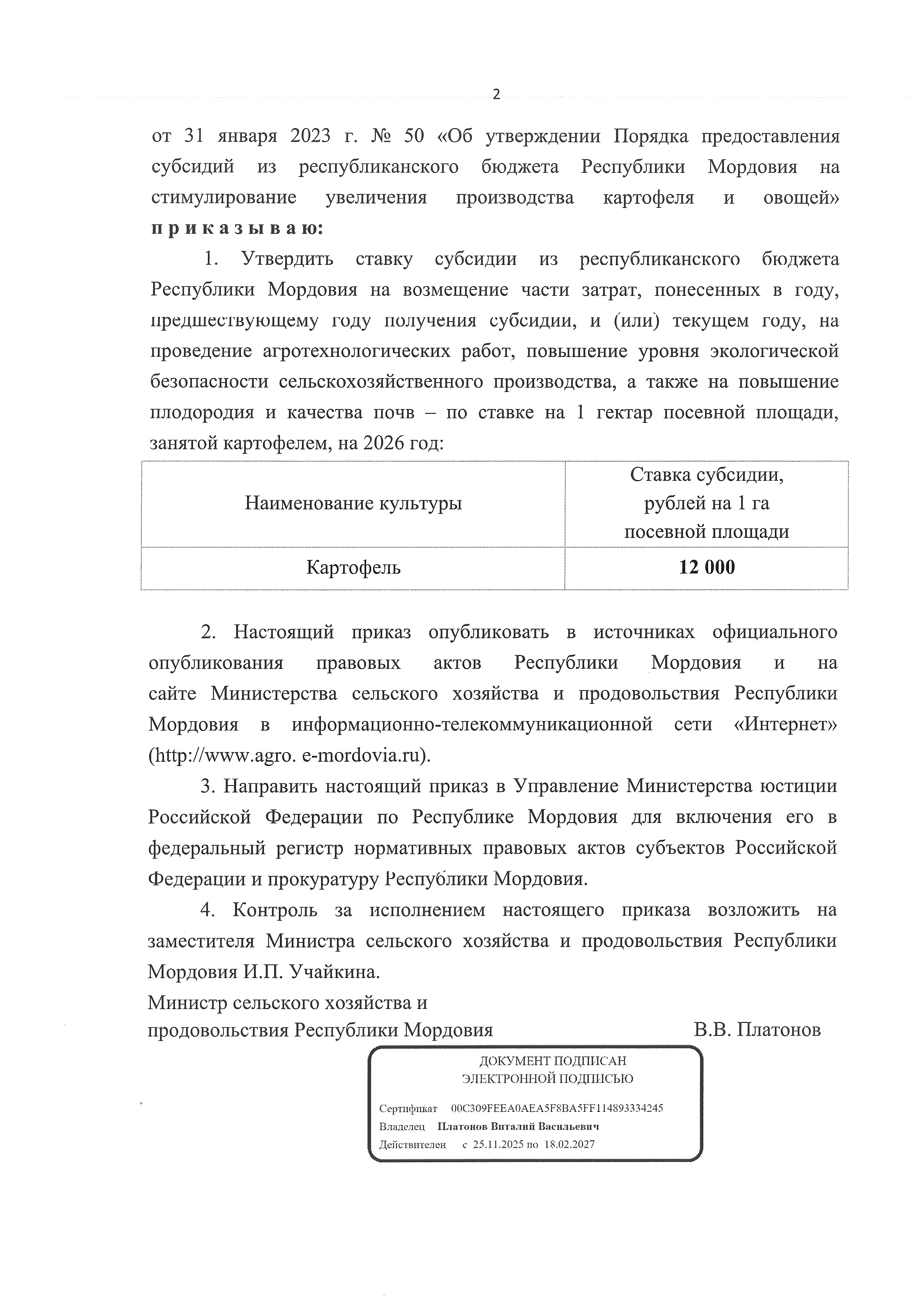 "Об утверждении ставки субсидии из республиканского бюджета Республики Мордовия на возмещение части затрат, понесенных в году, предшествующему году получения субсидии, и (или) текущем году, на проведение агротехнологических работ, повышение уровня экологической безопасности сельскохозяйственного производства, а также на повышение плодородия и качества почв - по ставке на 1 гектар посевной площади, занятой картофелем, на 2026 год"