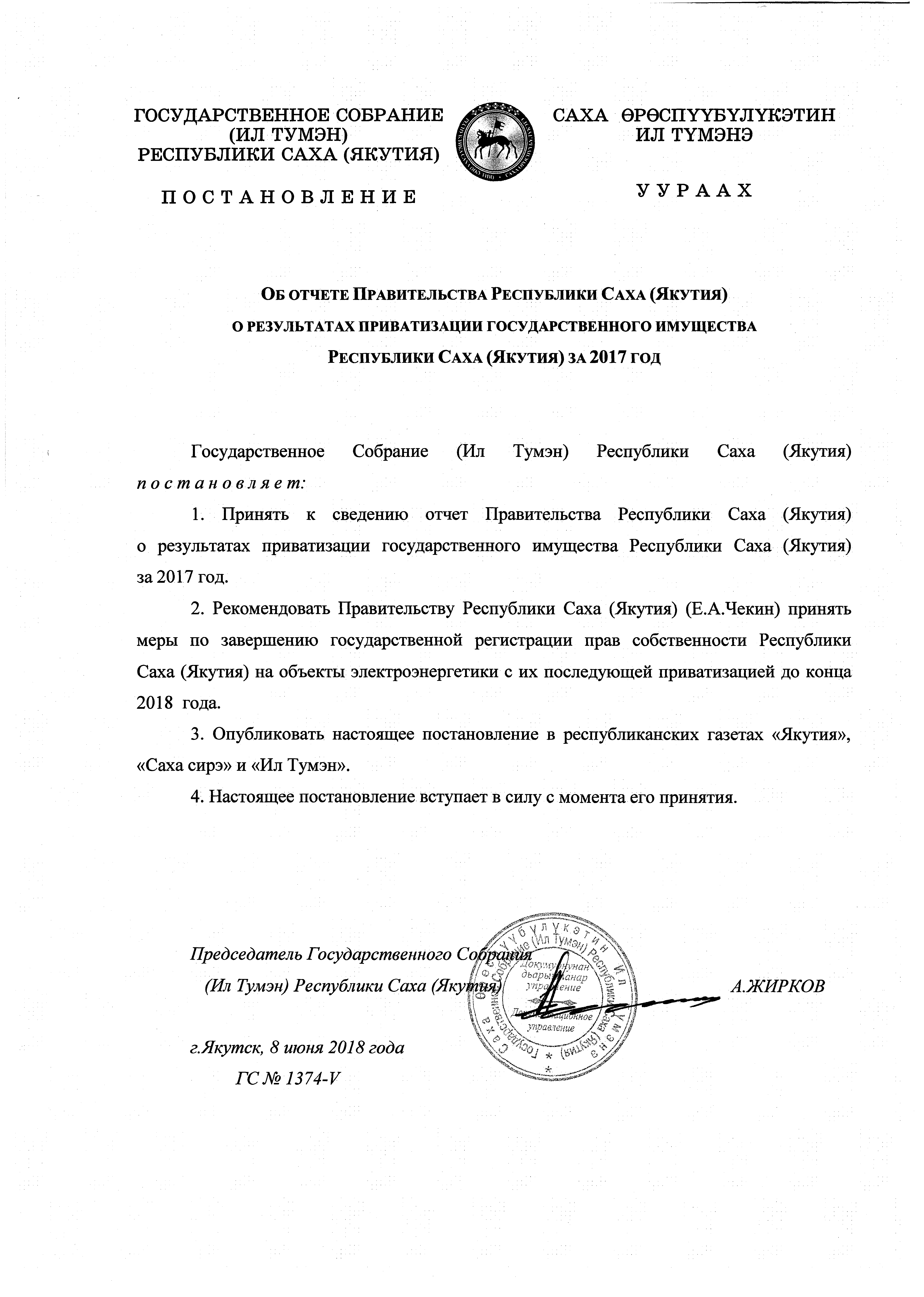 Постановление Государственного Собрания (Ил Тумэн) Республики Саха (Якутия) от 08.06.2018 ГС № 1374-V