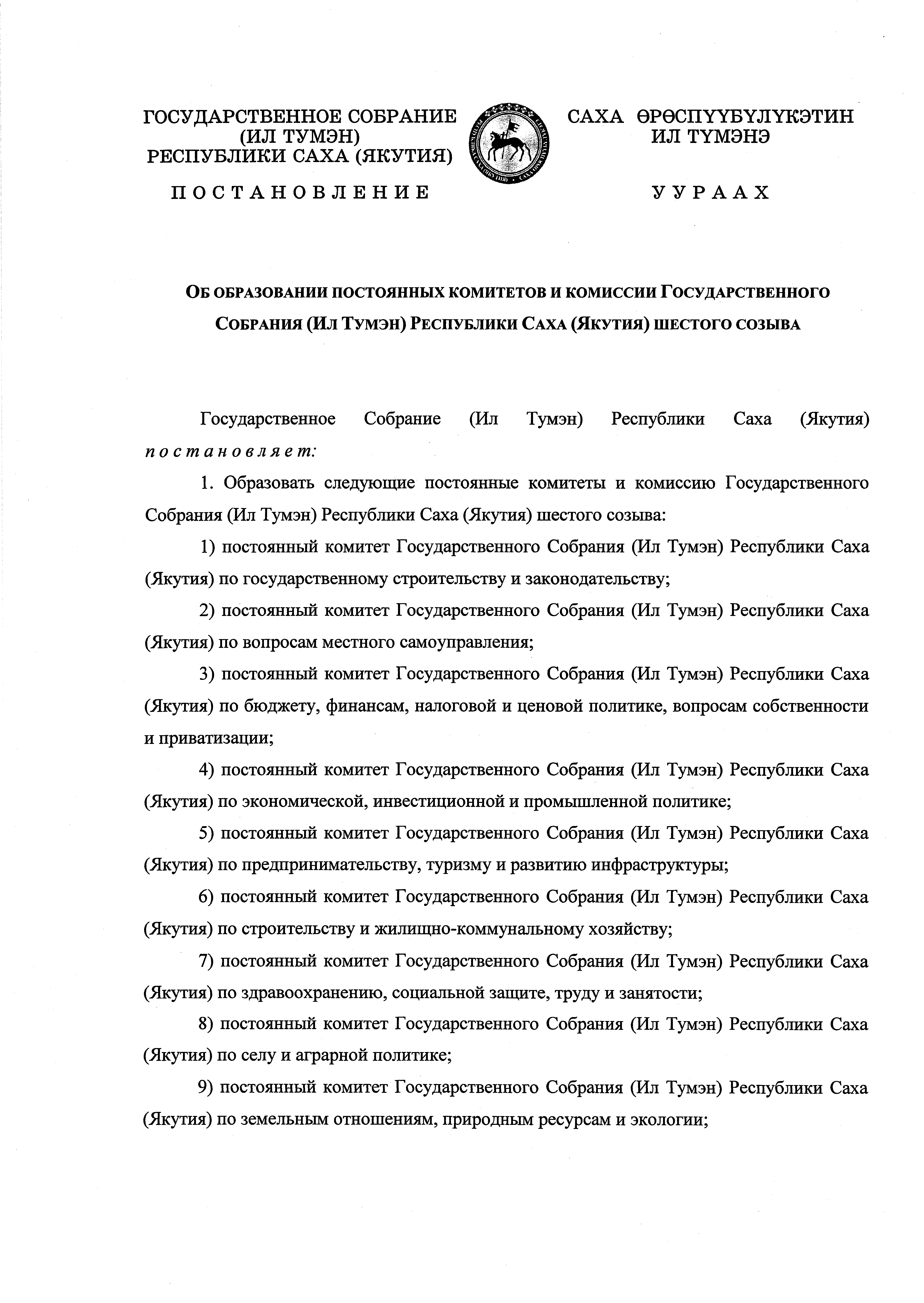 "Об образовании постоянных комитетов и комиссии Государственного Собрания (Ил Тумэн) Республики Саха (Якутия) шестого созыва"