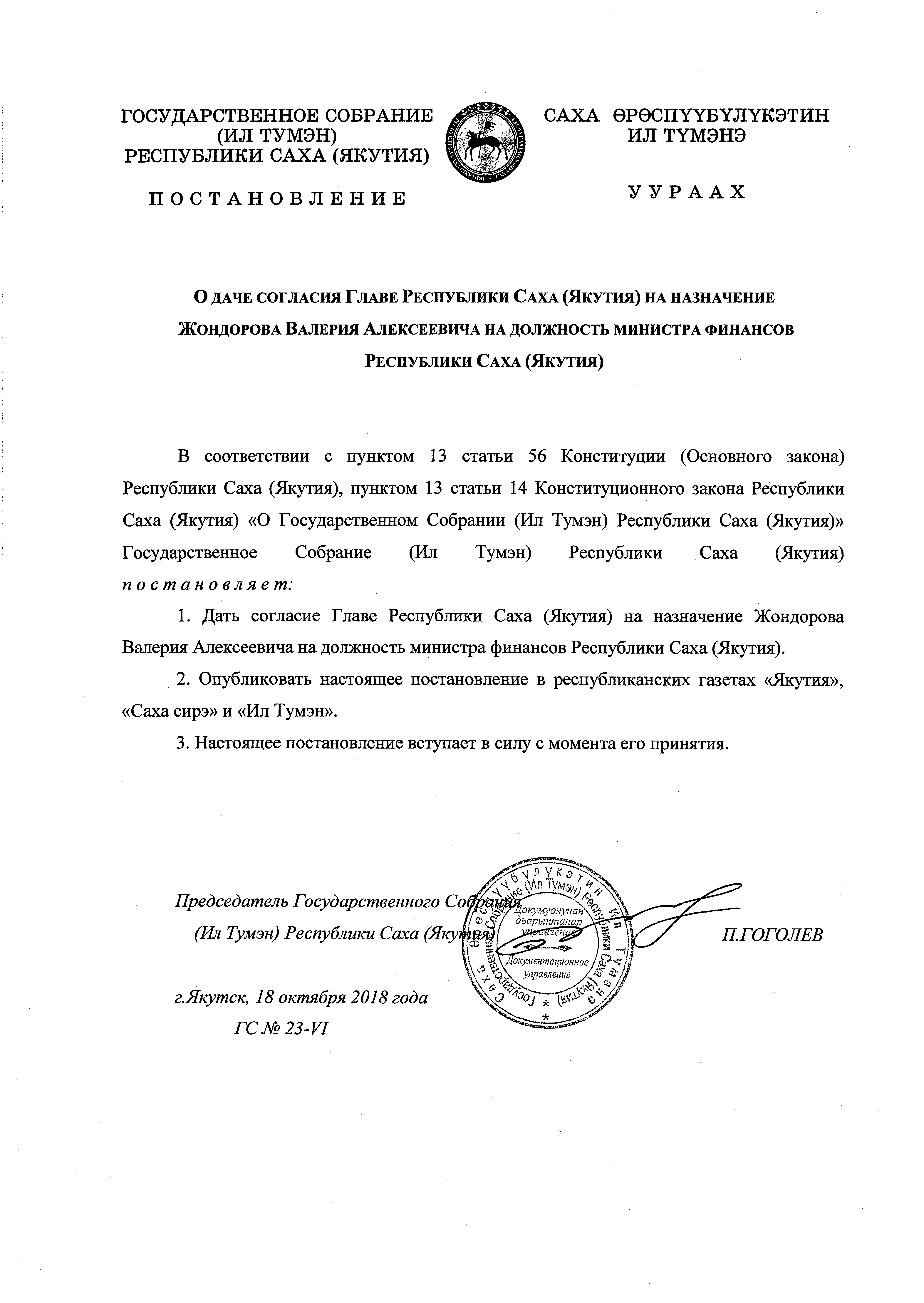 Постановление Государственного Собрания (Ил Тумэн) Республики Саха (Якутия) от 18.10.2018 ГС № 23-VI