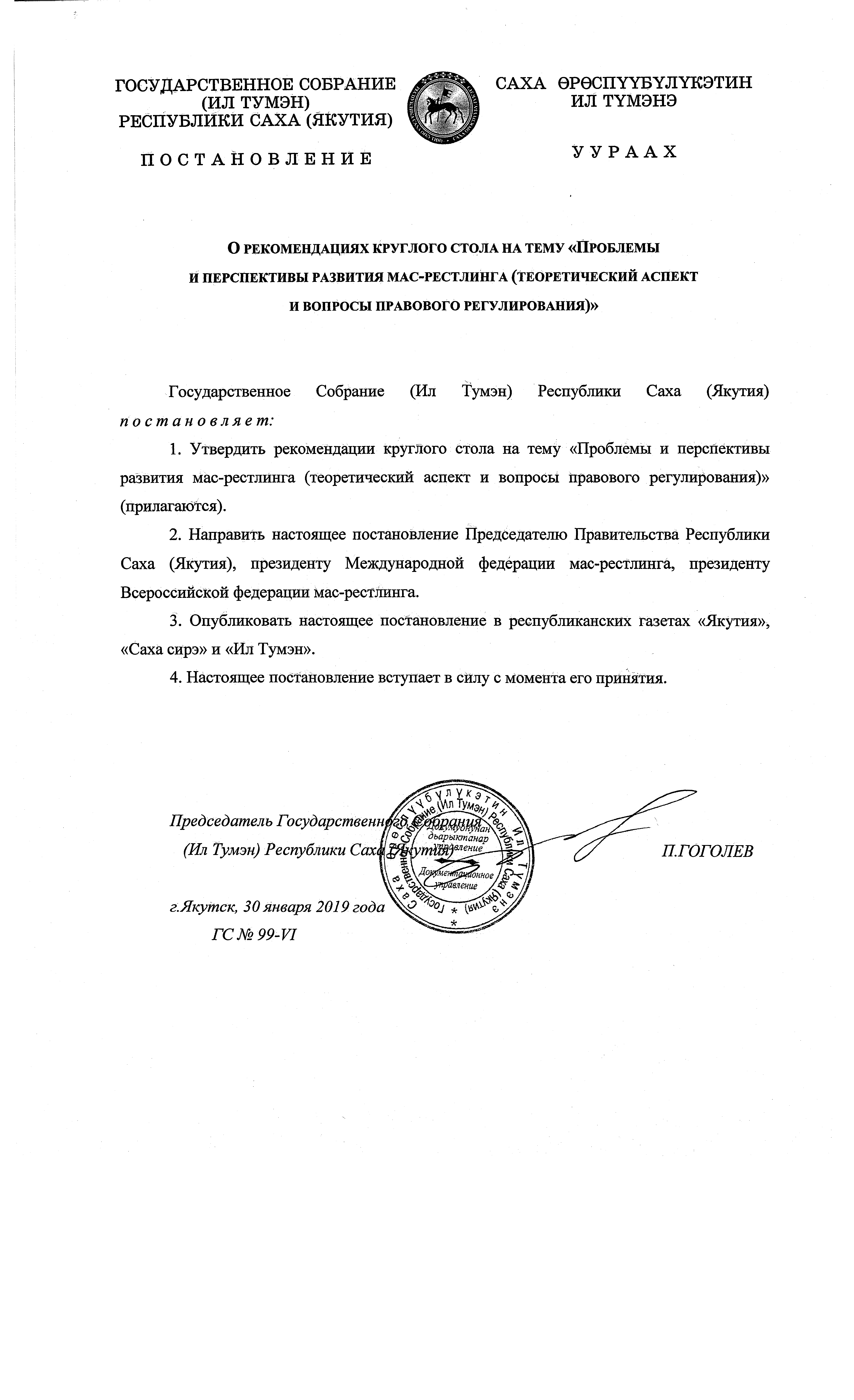 Постановление Государственного Собрания (Ил Тумэн) Республики Саха (Якутия) от 30.01.2019 ГС № 99-VI