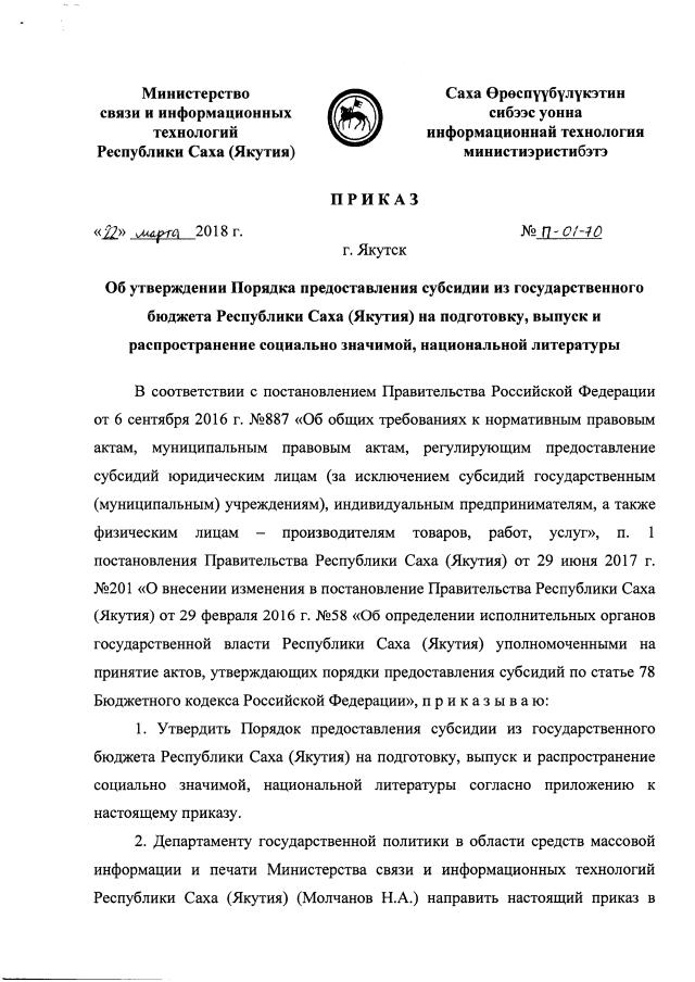 Приказ Министерства связи и информационных технологий Республики Саха (Якутия) от 22.03.2018 № П-01-70
