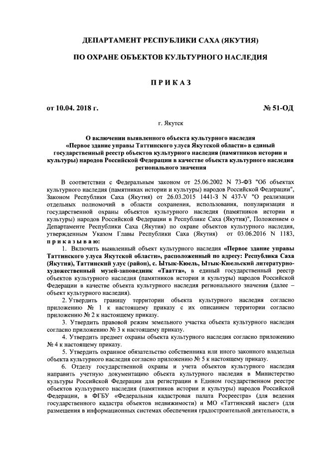 Приказ Департамента Республики Саха (Якутия) по охране объектов культурного наследия от 10.04.2018 № 51-ОД