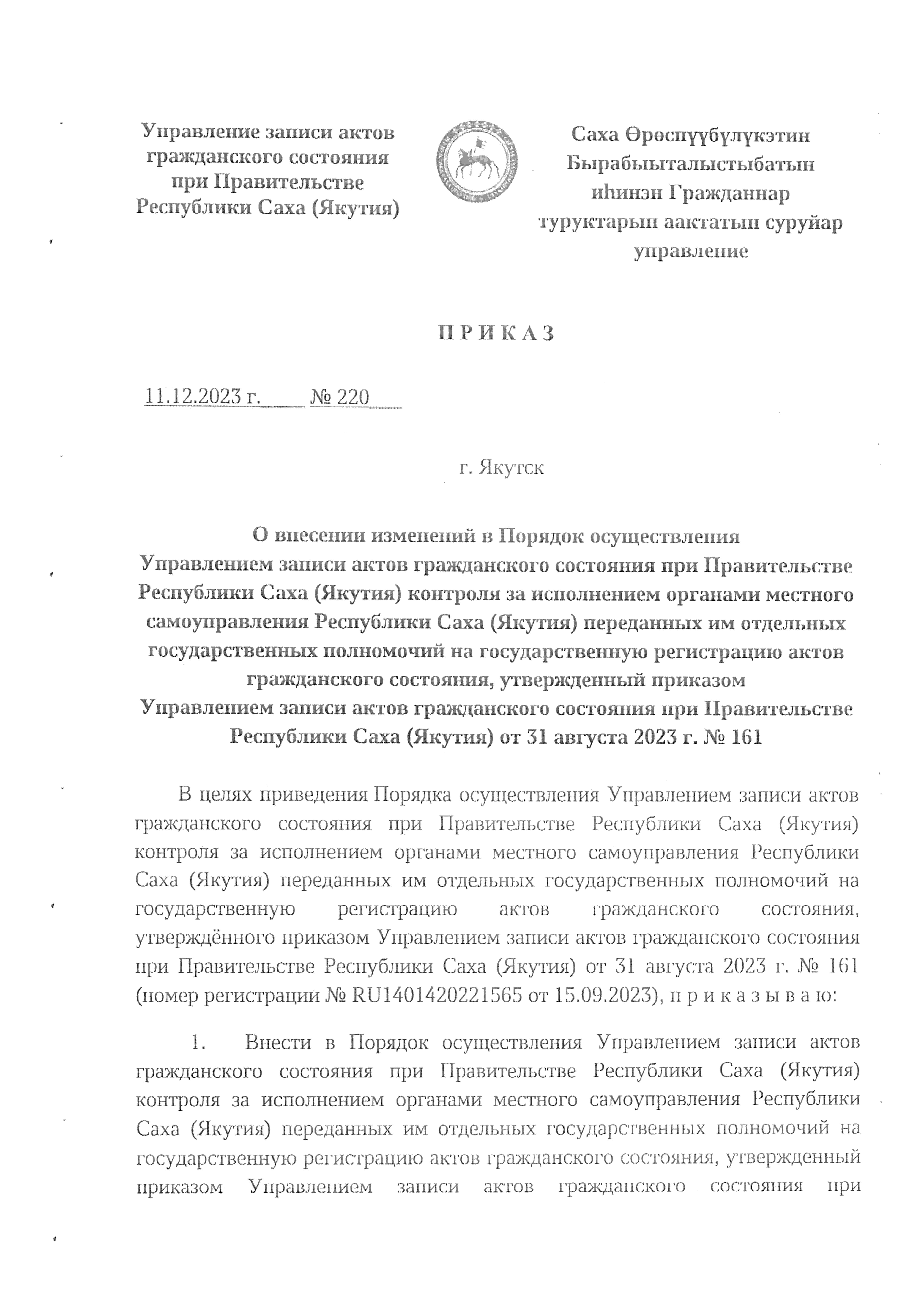 Приказ Управления записи актов гражданского состояния при Правительстве Республики Саха (Якутия) от 11.12.2023 № 220